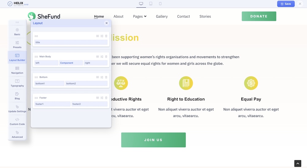 The following screenshot highlights the main layout module positions that we used in the current template. By using Layout Builder in Helix Ultimate, you're able to move positions or even change their sizes in the grid (based on Bootstrap 4). Our in-built layout builder from template settings provides you the opportunity to add new positions, columns, and rows wherever you need and to move the elements as much as you want. Even hide some of them in the tablet or mobile view. More information & tips you will find inside Helix Ultimate Documentation.