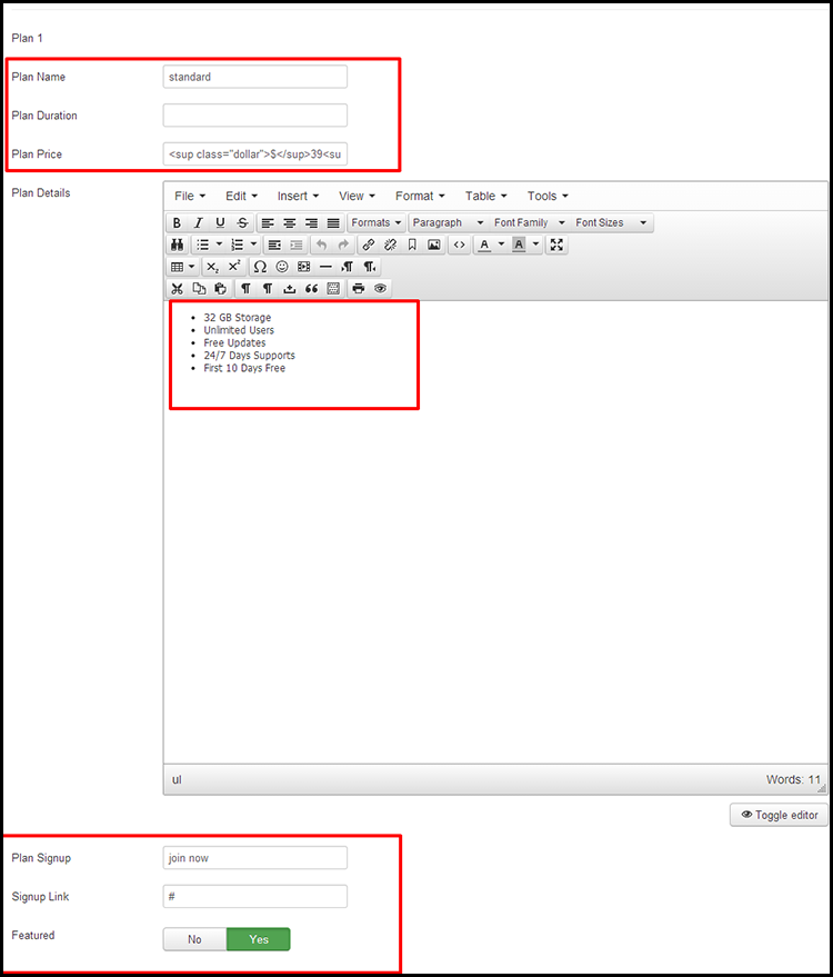 From Basic option we fixed the Plan Name, Plan Price, Plan Duration, Plan Details, Plan Signup, Signup Link. Here is another option for make the table featured. We do the same to the others, like Plan 2, Plan 3 and Plan 4.