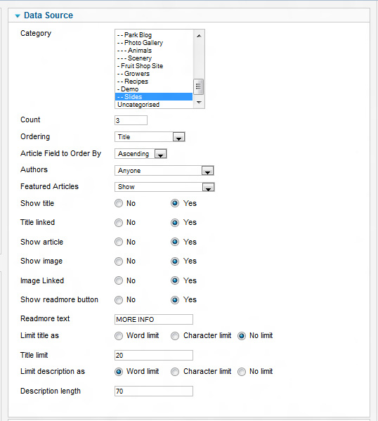 From data source options category have to be selected.Here count is 3.Title,readmore,description etc have to be fixed also.