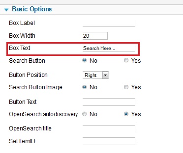 The “Text” that you want to show in your search box ,put that text at the Box Text field.