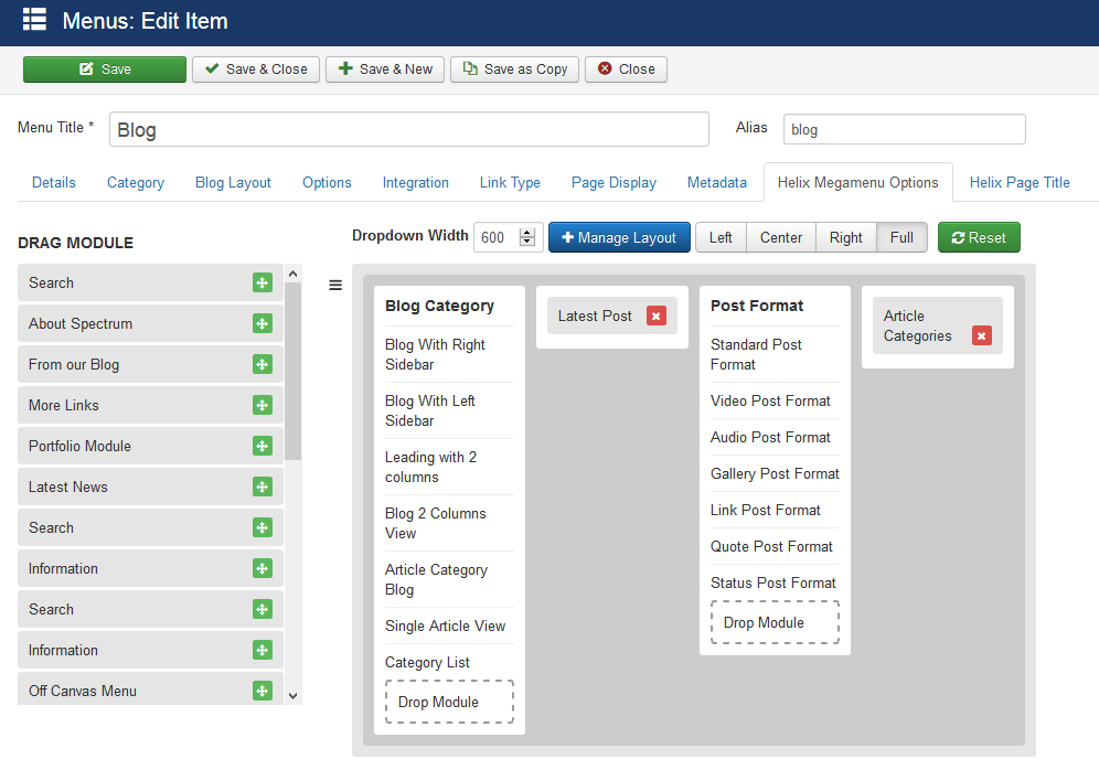 Where you have to check Helix tab named "Helix Megamenu Option" which allows you to change number or columns or add new one if you don't have any. Click blue button "Manage Layouts". In Spectrum we used 4 columns, where 2 were a modules. We just grab them from left side "DRAG MODULE" into empty columns, then we saved settings.