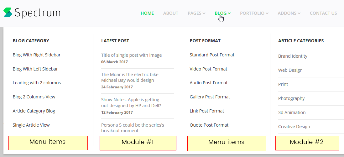 All templates bases on Helix3 allows you to use the modules inside sub-menu (read more), not only inside Template layout. In Spectrum QuickStart in "Blog" we used two Joomla! core modules: Latest Articles and Article Categories.