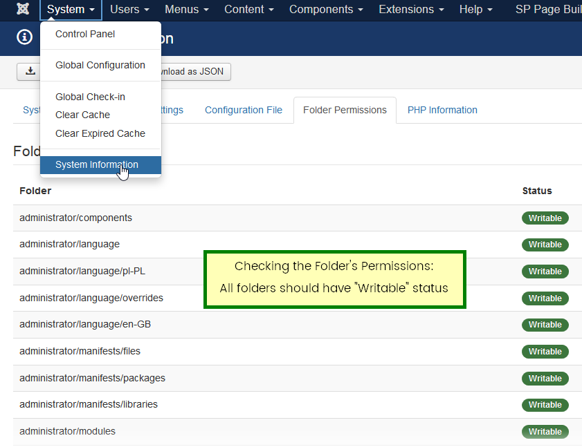 - Go to System > System Information. Click on the tab called Folder Permissions and make sure all the folders listed are green: "Writable". If not, change permissions for folders to 755 - use FTP tool for this task.