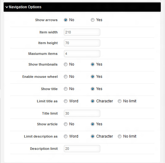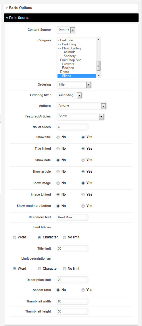 At basic options slide width and Height have to put.Here slide width is 624px and Height is 280px.