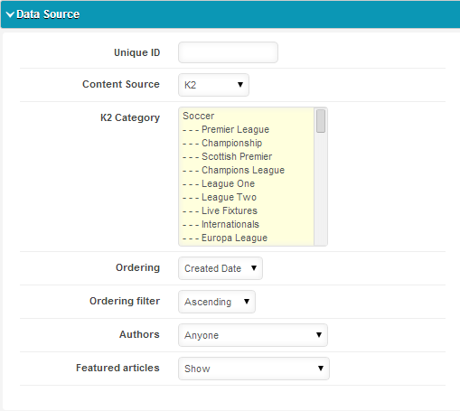 Here we select the content source by k2. Also select the k2 categories which will be showing on the Headlines.