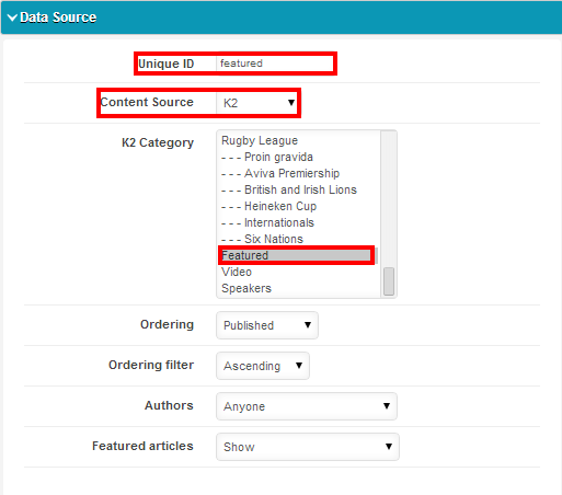 Here we made the unique id as featured. And select the content source by k2. Also select the k2 category by featured.