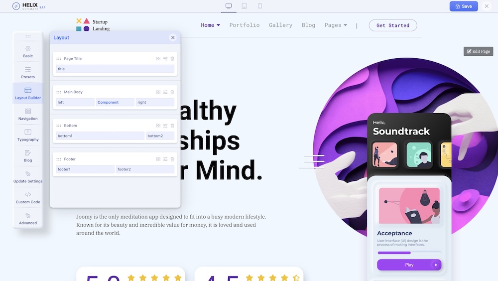 The following screenshot highlights the main layout module positions that we used in the current template. By using Layout Builder in Helix Ultimate, you're able to move positions or even change their sizes in the grid (based on Bootstrap 4). Our in-built layout builder from template settings provides you the opportunity to add new positions, columns, and rows wherever you need and to move the elements as much as you want. You can find more information & tips inside the Helix Ultimate Manual.