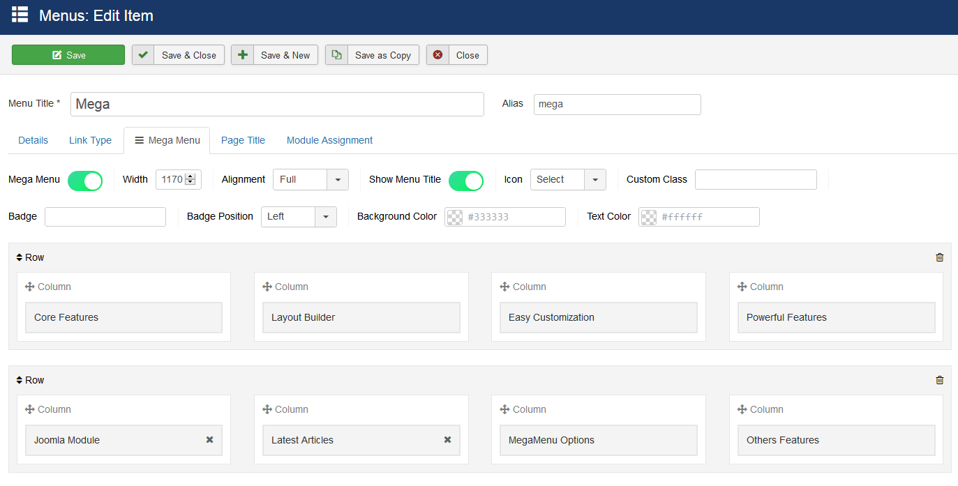 The Stellar template supports only one menu type—a horizontal menu located in the Header area. Currently, MegaMenu features are available exclusively in this position.