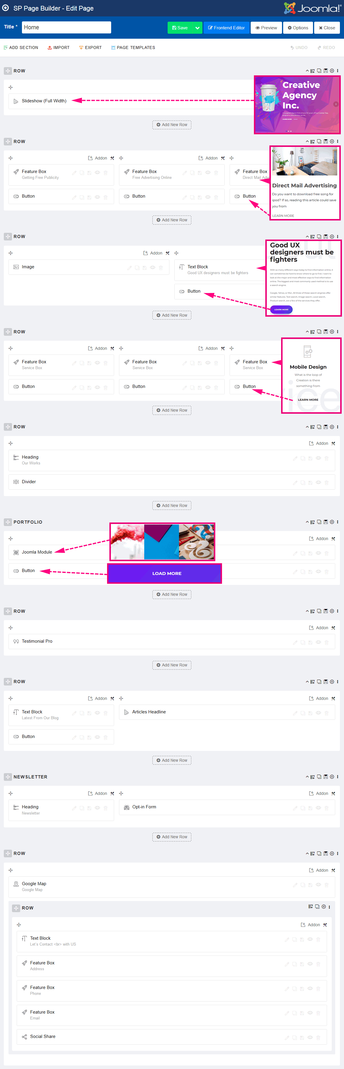The default homepage in the Stellar template demo was created using the SP Page Builder Pro component.