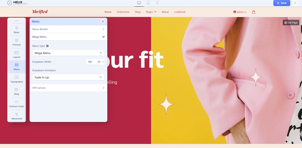 To explore the Thrifted template's menu settings through the Helix Ultimate editor, start by accessing your Joomla admin panel. From there, go to System > Templates > Site Template Styles > Select Thrifted-default > Template Options. In the Helix Ultimate’s sidebar, click on the Menu tab, where you'll find three menu configuration options: Menu Builder, Mega Menu, and Off-canvas Menu.