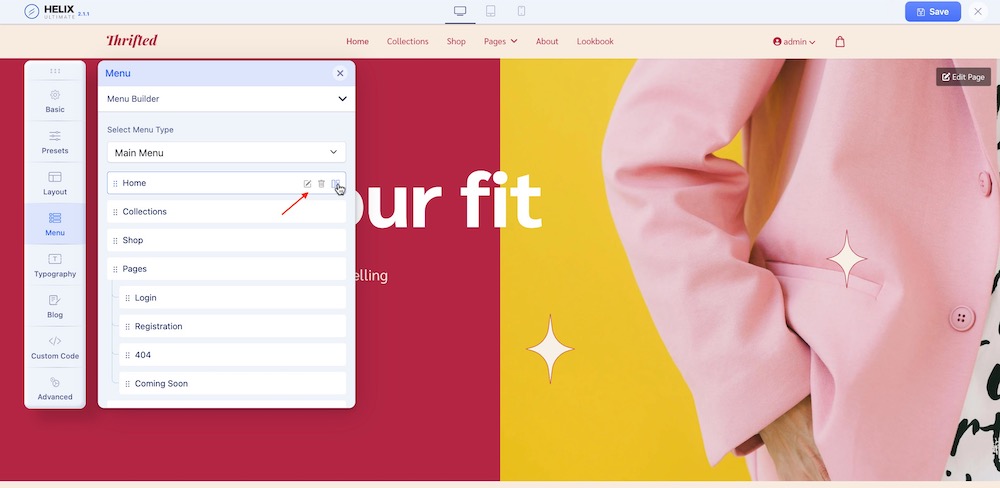 You can add a menu item to the existing menu from the menu builder option. All the menu items you see in the Thrifted template are listed here along with the sub menus. Upon hovering on each of the items you can edit, delete, or access the extra settings and Mega Menu option.