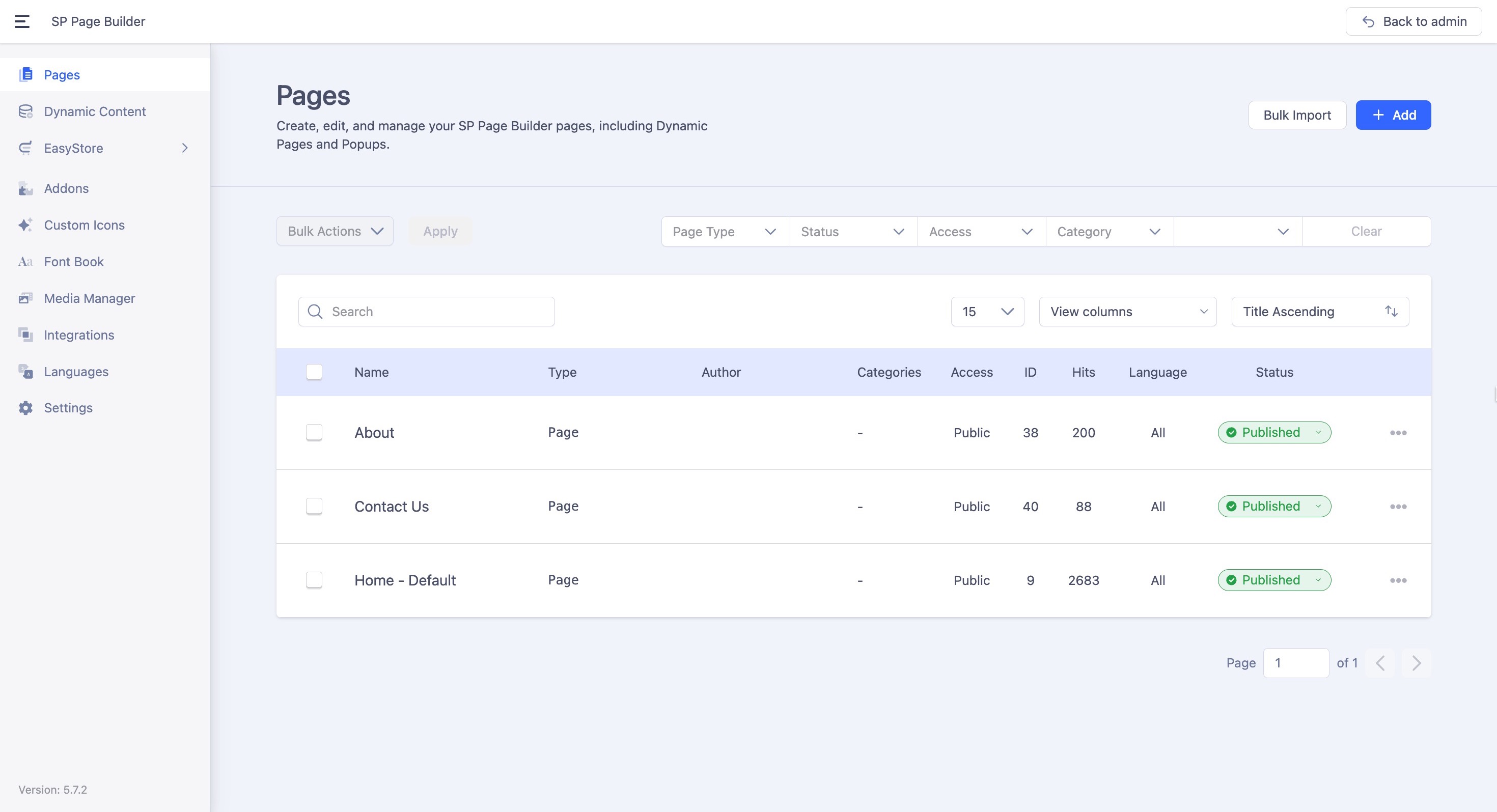 The SP Page Builder dashboard includes all pages created with SP Page Builder Pro. Use SP Page Builder Pro's backend or front-end editor to edit or customize any page. To do that, from the Joomla dashboard, go to Components > SP Page Builder Pro > Pages and select the page you want to edit.