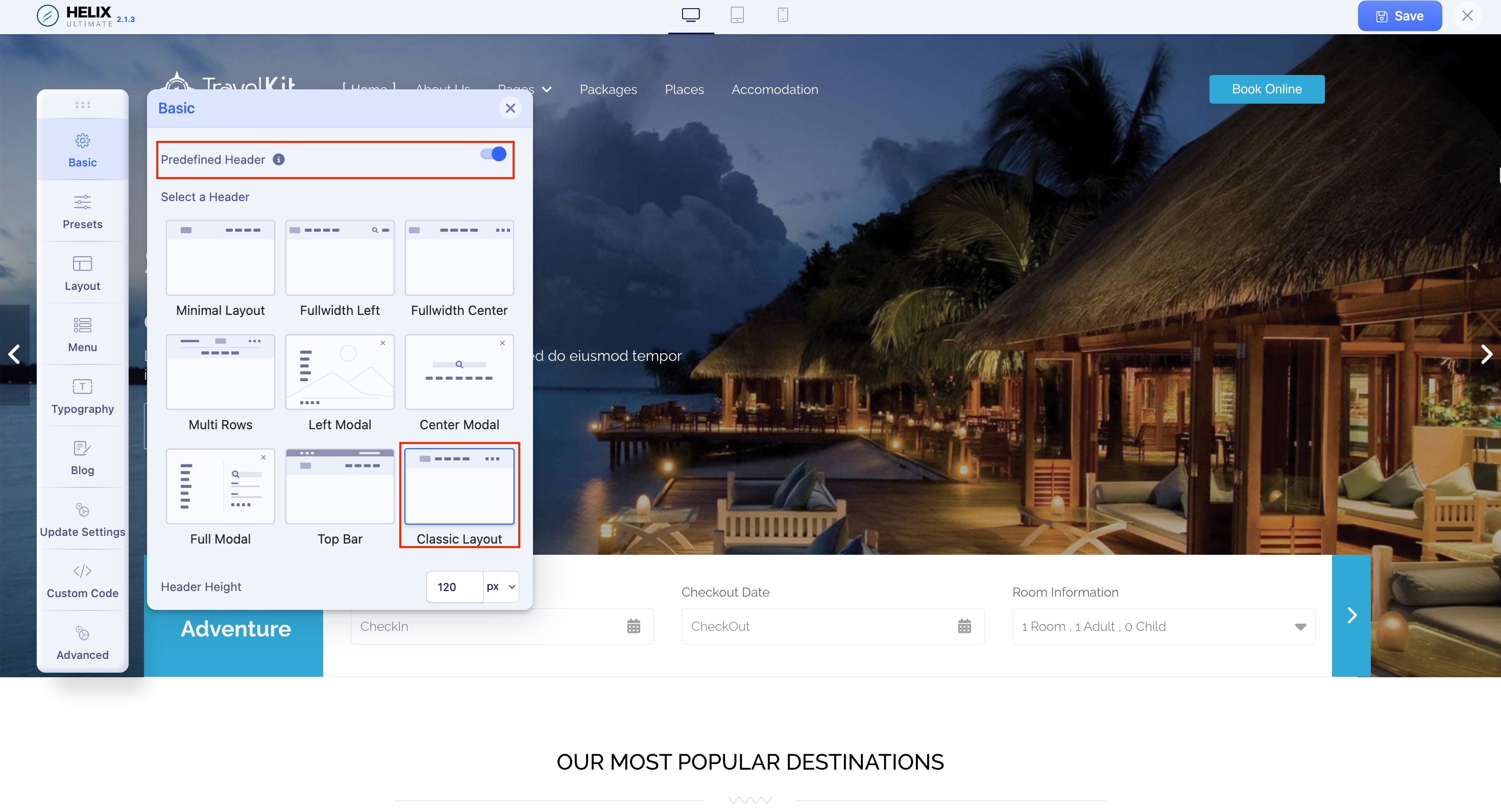 Upon enabling the Predefined Header option, you can find the header layout used in this template. You will be presented with a series of header layouts. For this template, the Minimal Layout header has been used. You can easily adjust this by selecting the other available layouts in this option that best suit your needs.