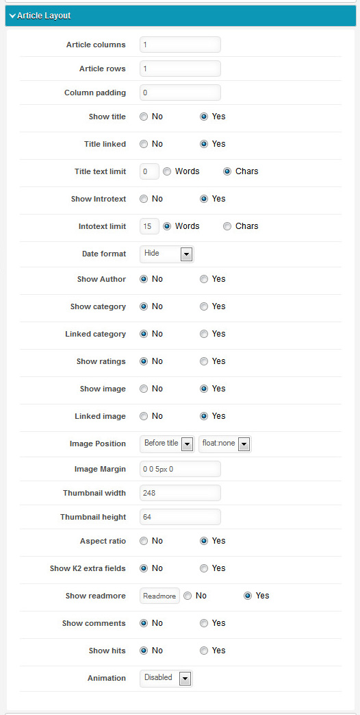 Here Article columns is 1 and Article rows is 1,Title,Date,Category,Thumbnail Image width and height have to be fixed.