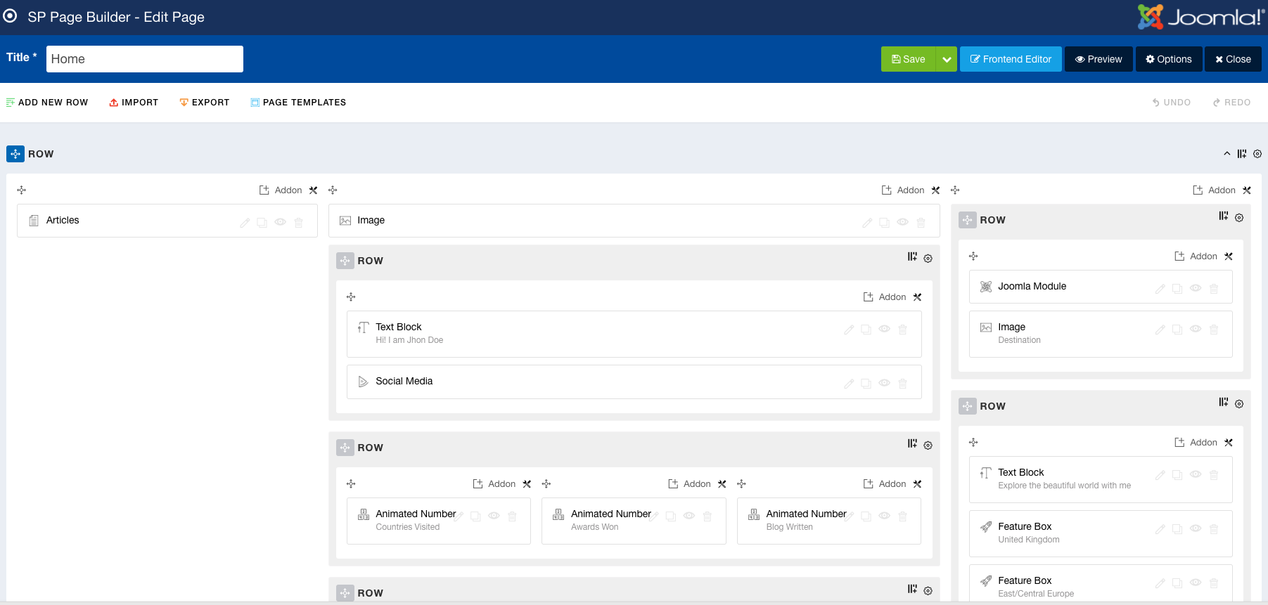 For the frontend editor, you just have to click the frontend editor on top of SP Page Builder and log in to your template. Now, click edit page. With this frontend editor will be activated. You can enjoy amazing drag and drop as well as row option editing functionalities with the editor.