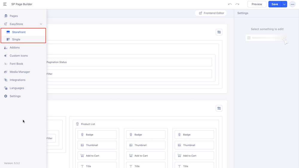 You can also access this template's Storefront and Single Product page from your dashboard’s Component > SP Page Builder Pro > EasyStore. This will take you to the backend editor of the Storefront and you can start editing your Storefront page. Also, to access the Single Product page, choose the Side Topbar (Hamburger Menu) and expand the EasyStore tab. From here you can choose this template's Single Product page and start editing it.