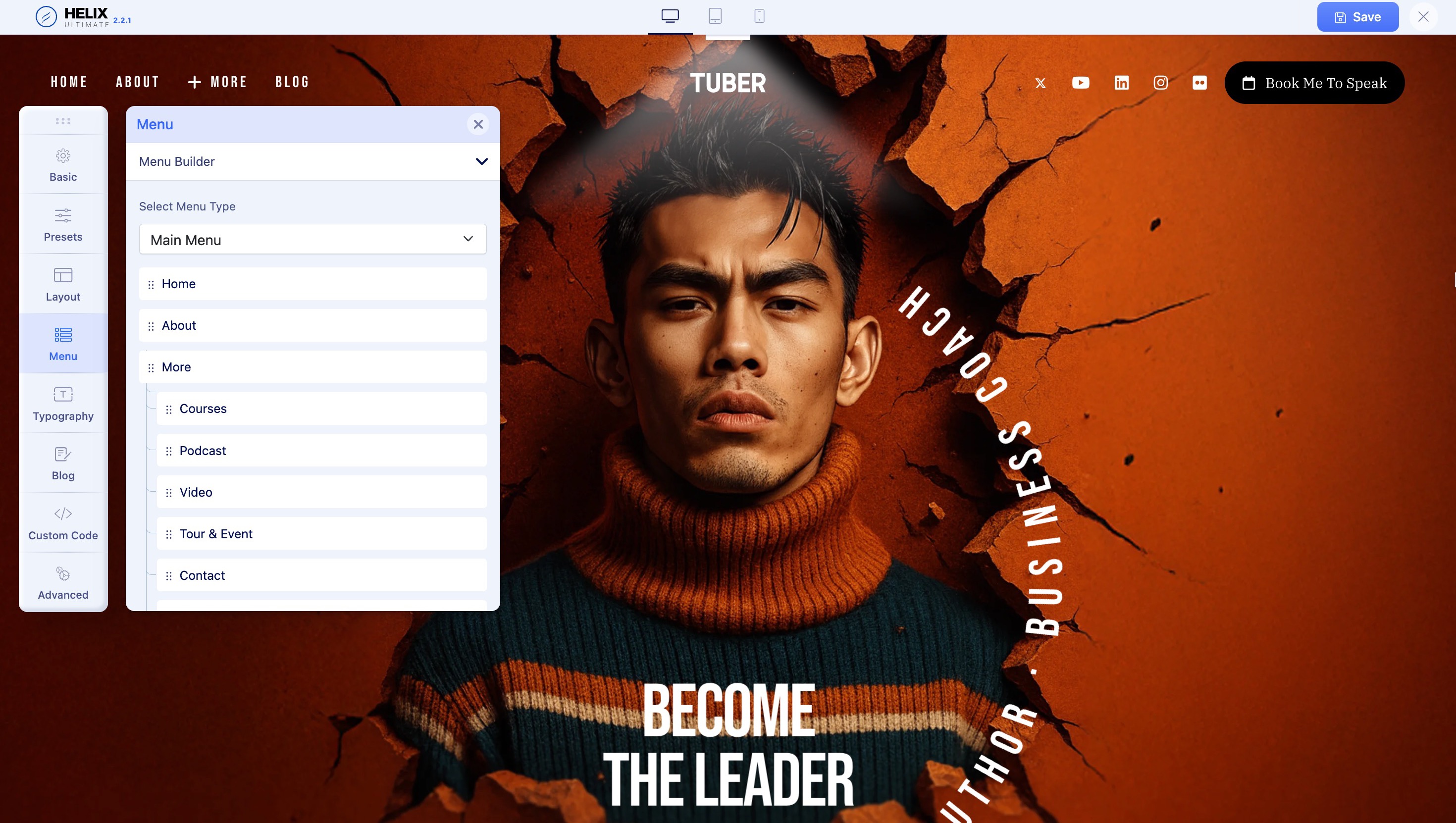 To explore the Tuber template's menu settings through the Helix Ultimate editor, start by accessing your Joomla admin panel.