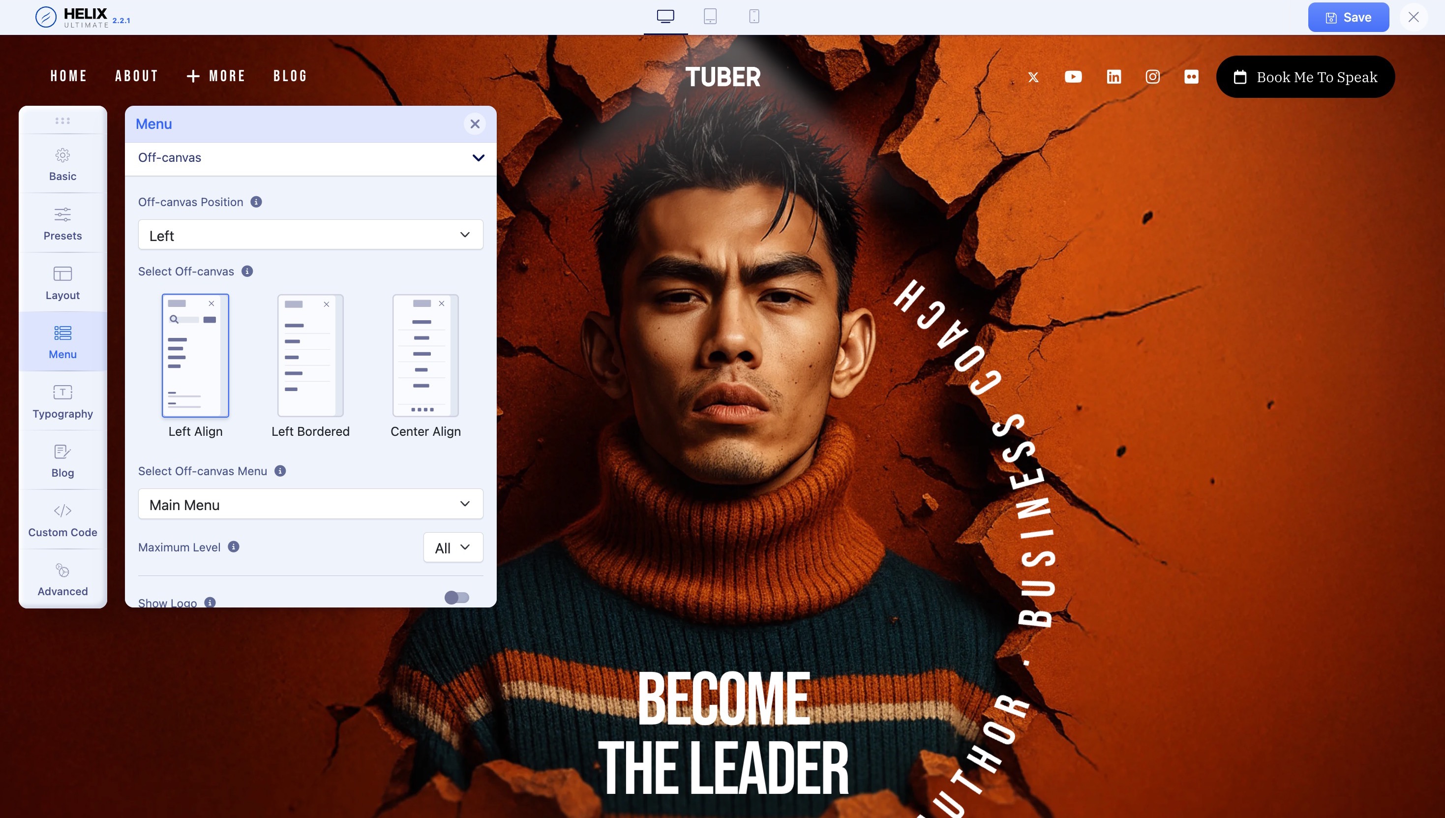 By default, Tuber’s off-canvas menu is positioned on the left with a left alignment. You can easily customize and adjust both the position and alignment using the available options.