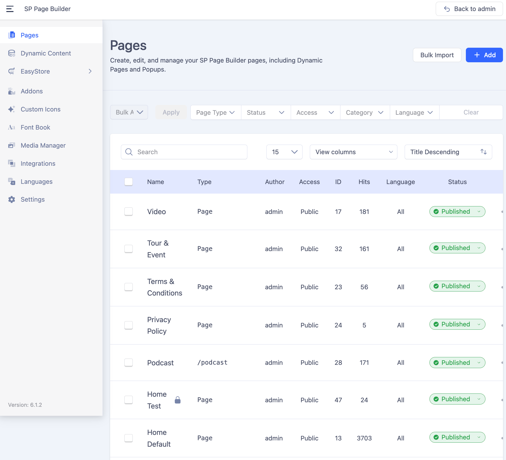 SP Page Builder dashboard includes all pages created with SP Page Builder Pro. Use SP Page Builder Pro's backend or front-end editor to edit or customize any page. To do that, from the Joomla dashboard, go to Components > SP Page Builder Pro > Pages and select the page you want to edit.