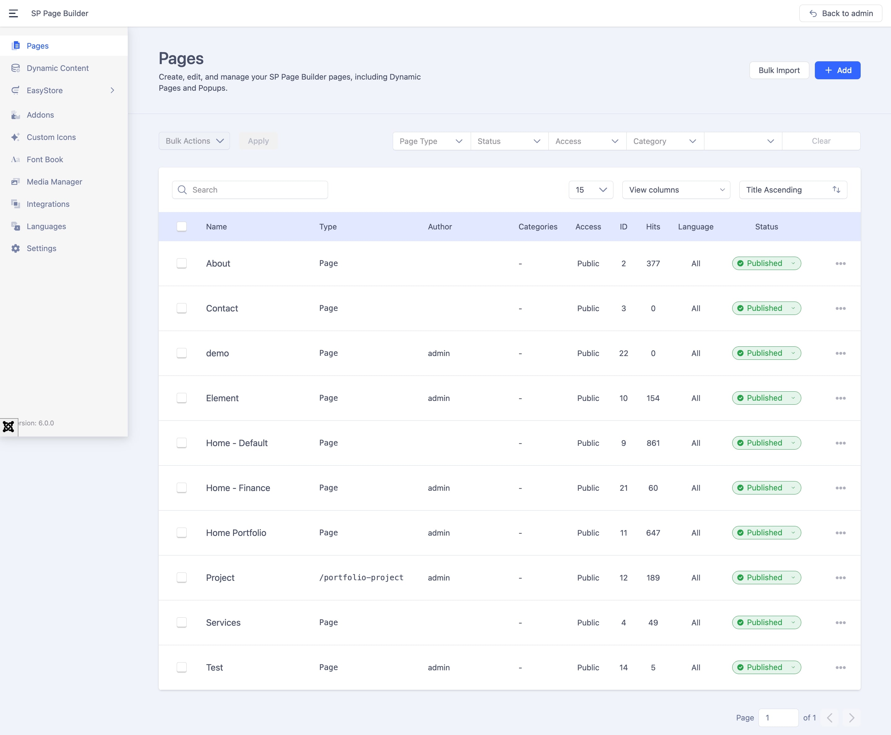 The SP Page Builder dashboard includes all pages created with SP Page Builder Pro. Use SP Page Builder Pro's backend or front-end editor to edit or customize any page. To do that, from the Joomla dashboard, go to Components > SP Page Builder Pro > Pages and select the page you want to edit.