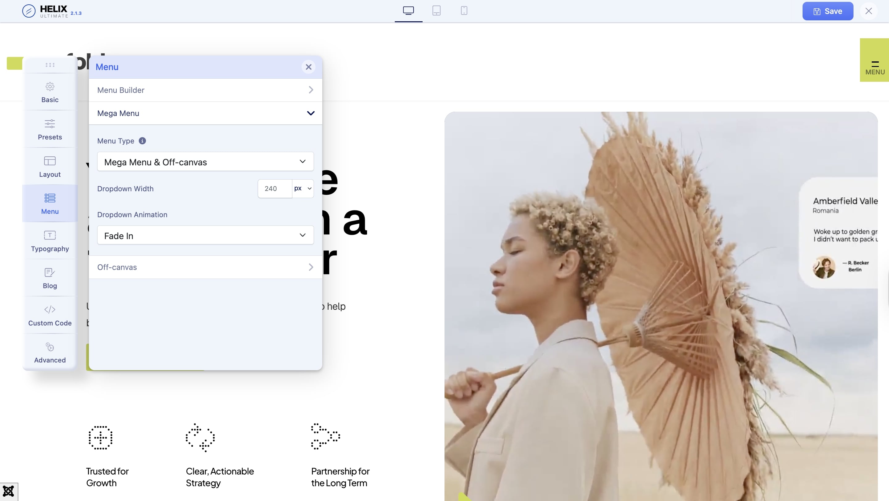 From there, go to System > Templates > Site Template Styles > Select Unfold-Default > Template Options. In the Helix Ultimate’s sidebar, click on the Menu tab, where you'll find three menu configuration options: Menu Builder, Mega Menu, and Off-canvas Menu.
