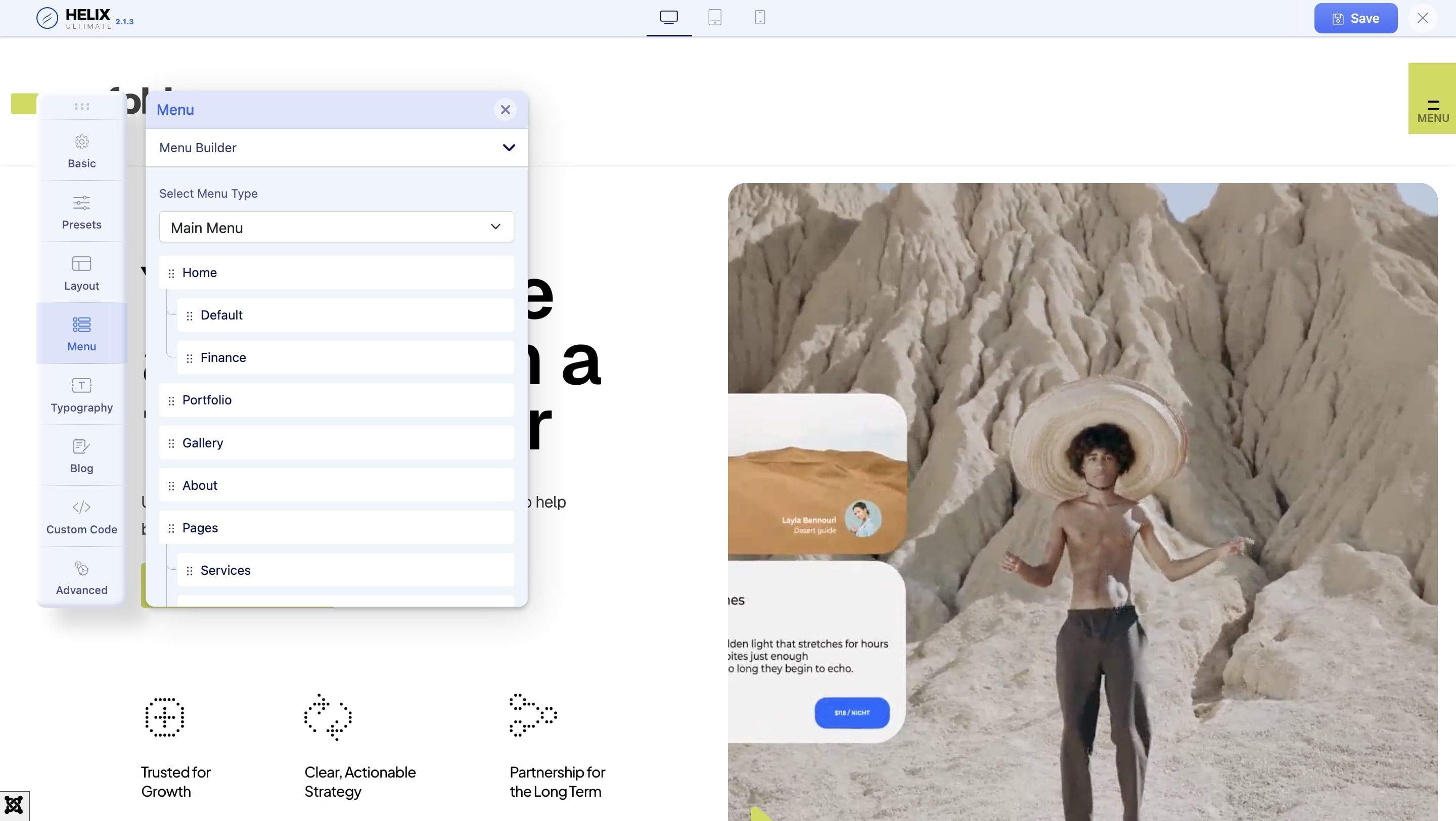 The Unfold Joomla template doesn't include a mega menu by default. However, you can easily access the option to enable Mega Menu by hovering over the menu items in the Menu Builder.