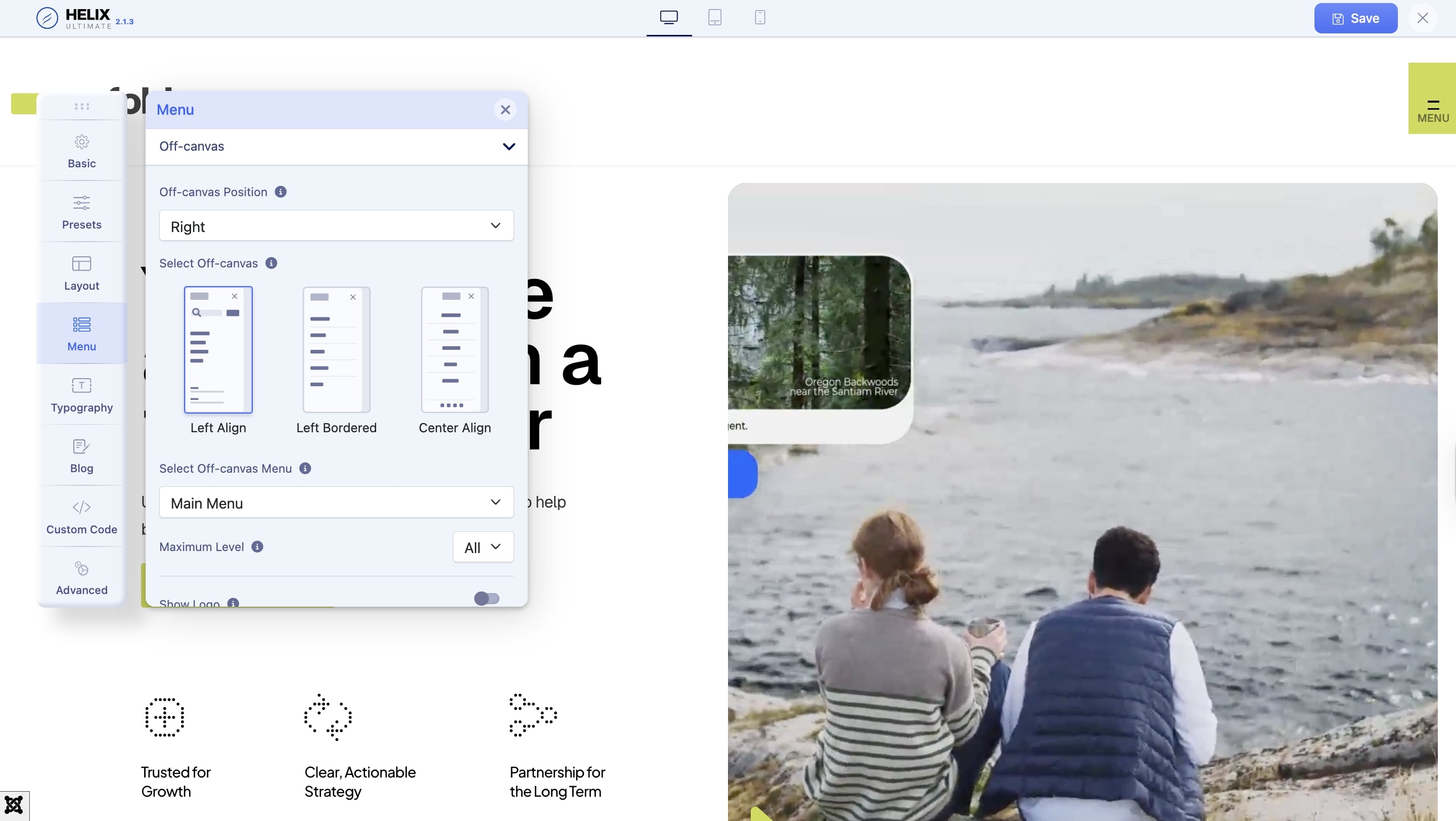 By default, Unfold’s off-canvas menu is positioned on the right with a left alignment. You can easily customize and adjust both the position and alignment using the available options.