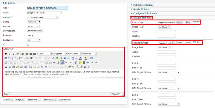 We put the text into the Article text area and select the images from Images and Links option. Here we select the intro image and full article image.