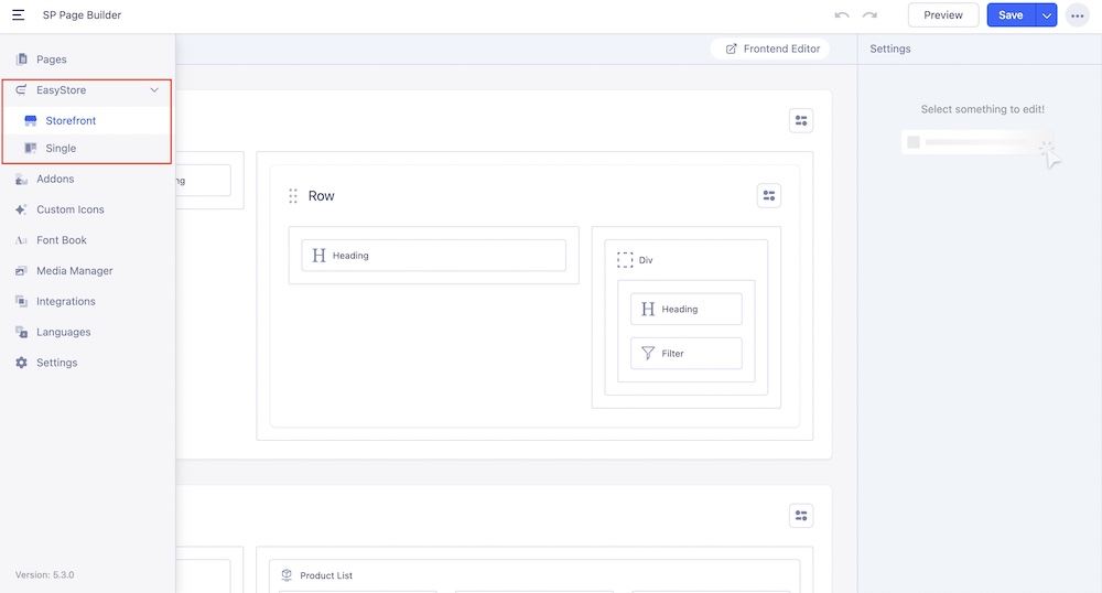 You can also access this template's Storefront and Single Product page from your dashboard’s Component > SP Page Builder Pro > EasyStore. This will take you to the backend editor of the Storefront and you can start editing your Storefront page. Also, to access the Single Product page, choose the Side Topbar (Hamburger Menu) and expand the EasyStore tab. From here you can choose this template's Single Product page and start editing it.