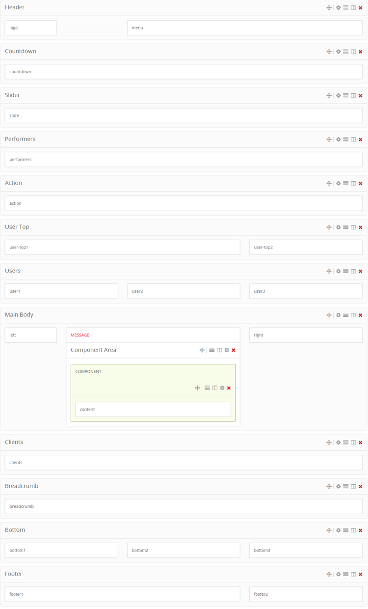 The screen-shot below highlights the layout positions we used in “Vocal” template. By using this layout builder users will be able to create unlimited positions more then before. Our new & latest layout builder provide the opportunity to create positions where you want & no limitation for creating positions. From now its unlimited.