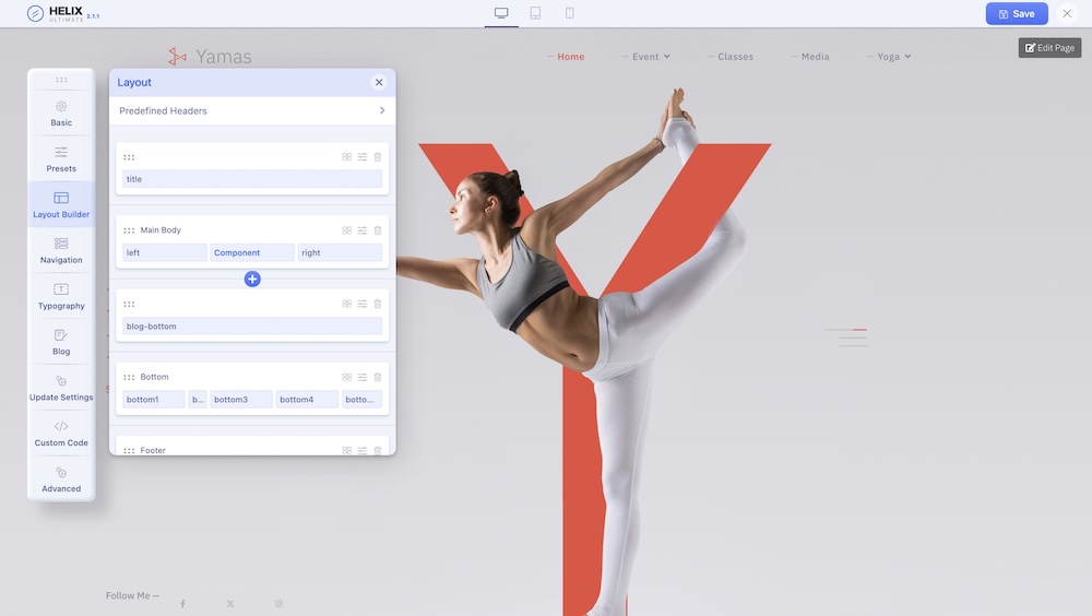 The following screenshot highlights the main layout module positions that we used in the current template. By using Layout Builder in Helix Ultimate, you're able to move positions or even change their sizes in the grid (based on Bootstrap 4). Our in-built layout builder from template settings provides you the opportunity to add new positions, columns, and rows wherever you need and to move the elements as much as you want. You can find more information & tips inside the Helix Ultimate Manual.