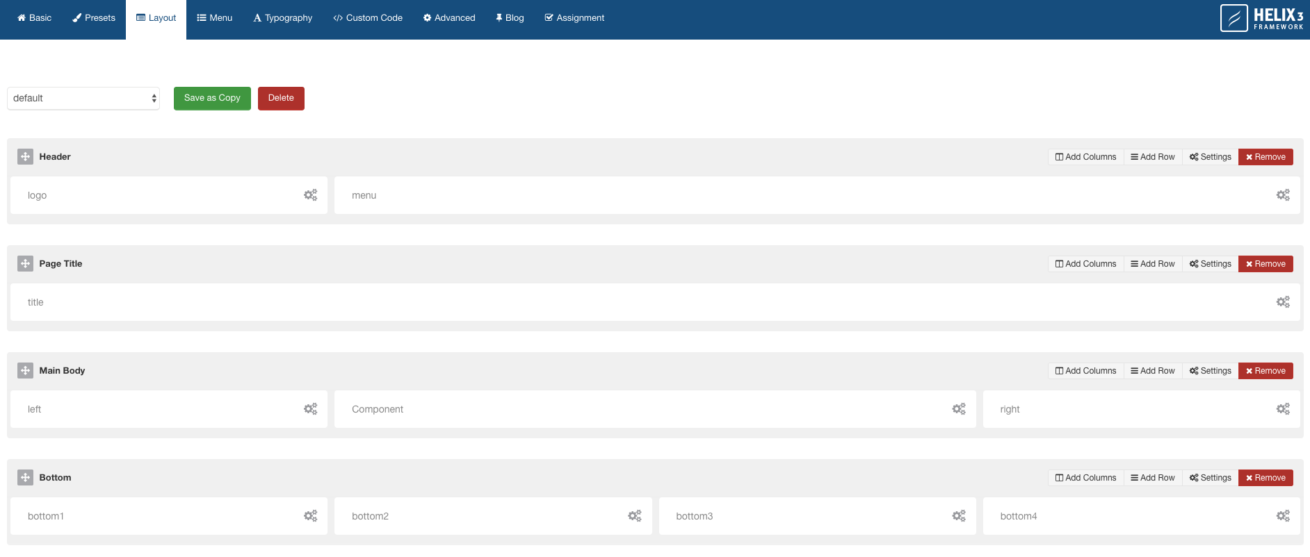 The following screenshots highlight the layout module positions that we used in a current template. By using Layout builder in Helix3 users will be able to move positions or change their size in the grid. Our in-built layout builder from template settings provide the opportunity to add new positions, columns, rows wherever you need as much as moving elements.