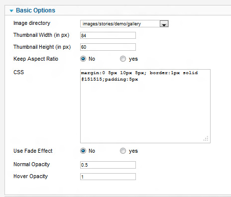 From Basic Options Image directory field have to be filled up and Thumbnail Width,Height and Aspect Ratio have to be fixed.