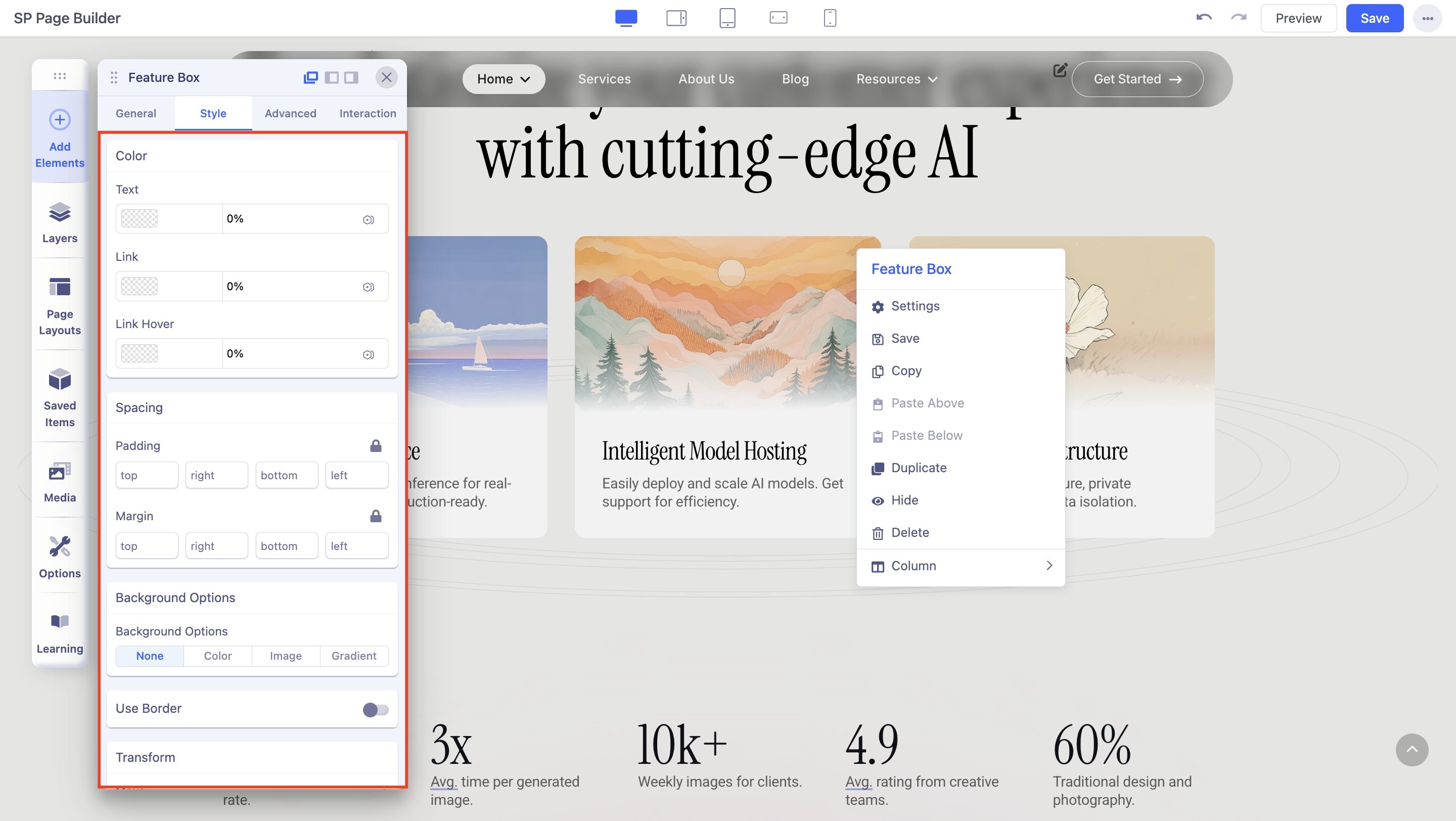 For instance, if you set Transform Origin of the x-axis to right and the y-axis to the bottom, the interaction effect will start the action from the bottom rightmost corner of the element.