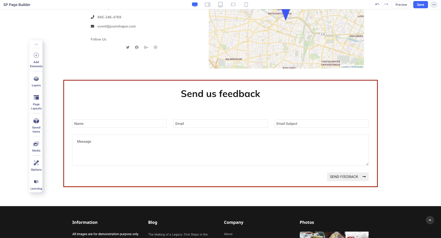 You can add the Contact Form addon to your page from the SP Page Builder sidebar. Simply drag the addon from the Addons panel and drop it on the section of the page where you want to add a contact form.