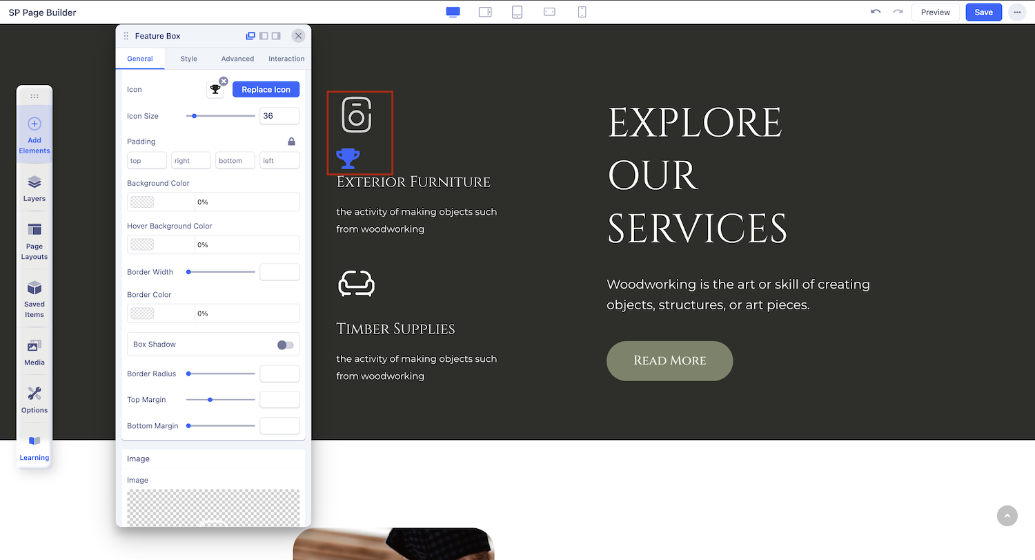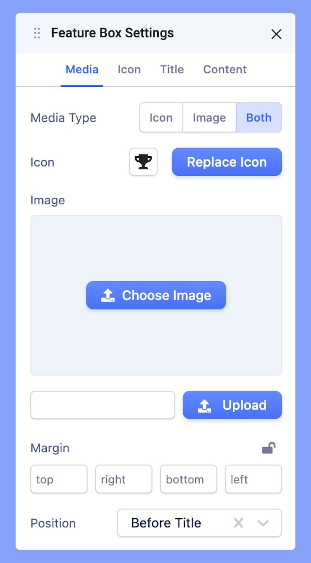 The Media tab comes with a Media Type option that lets you access the settings of your used icon or image or if you have used both icon and image in your Feature Box addon.
