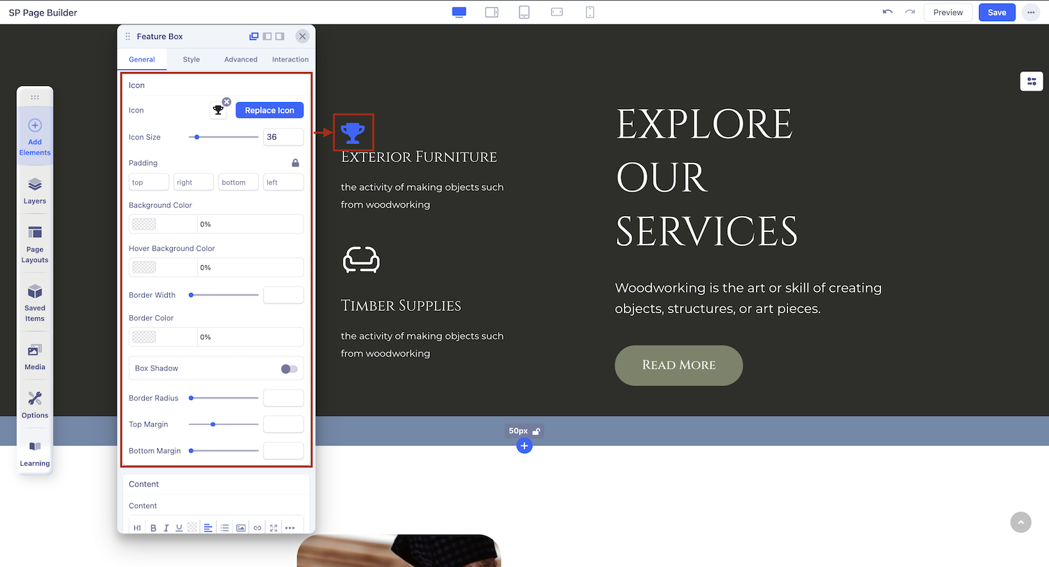 When you click on the Feature Box addon, the addon settings will open up. You can access the Feature Box settings and customize the addon to fit your needs.