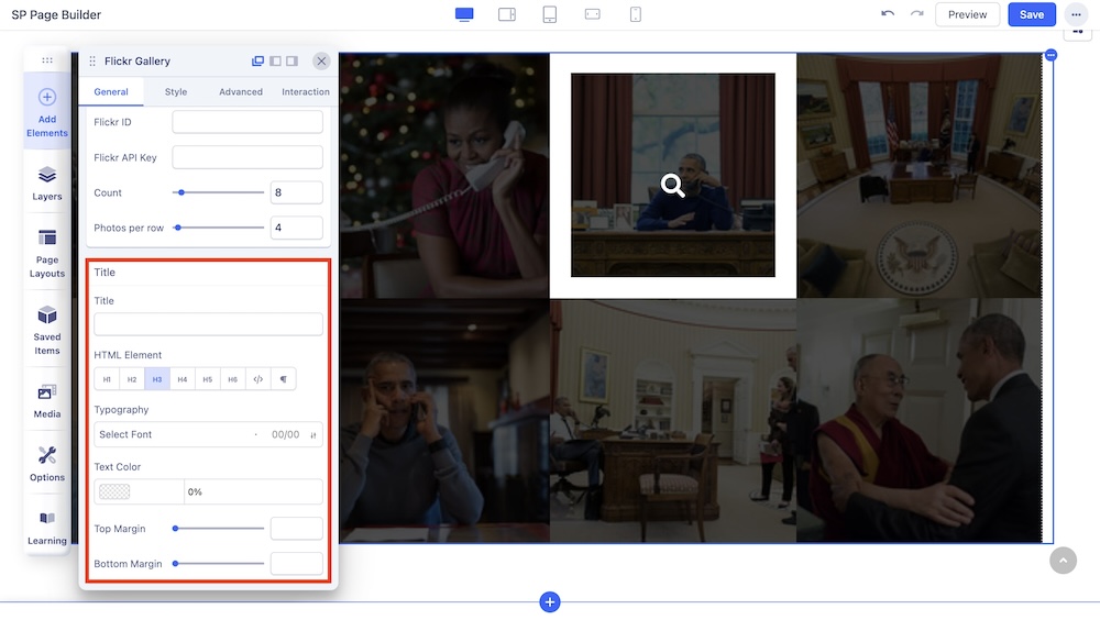 SP Page Builder comes with the powerful Flickr Gallery addon for you. Use the Flickr Gallery addon so that you can display an unlimited number of images with Flickr Gallery.
