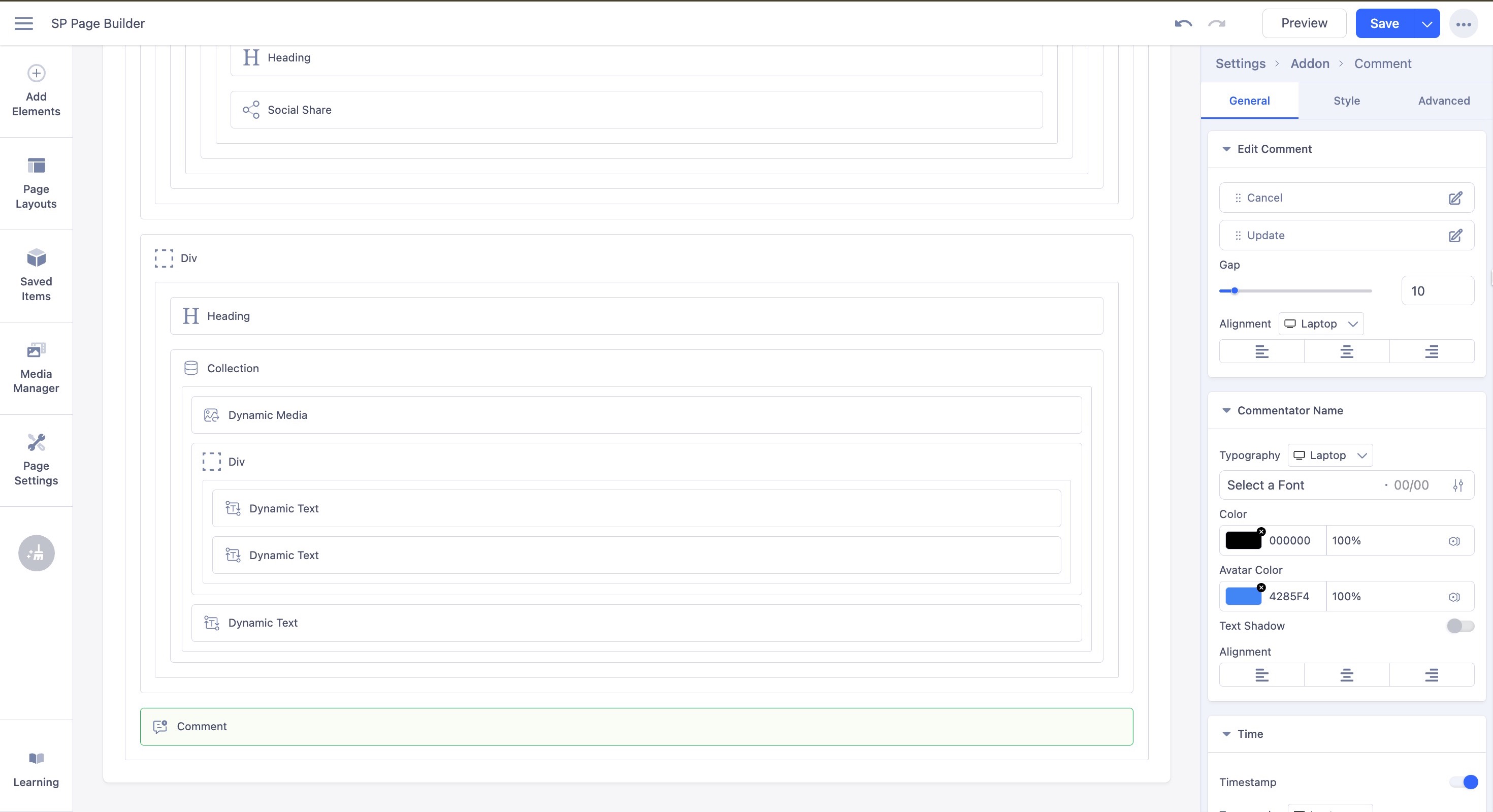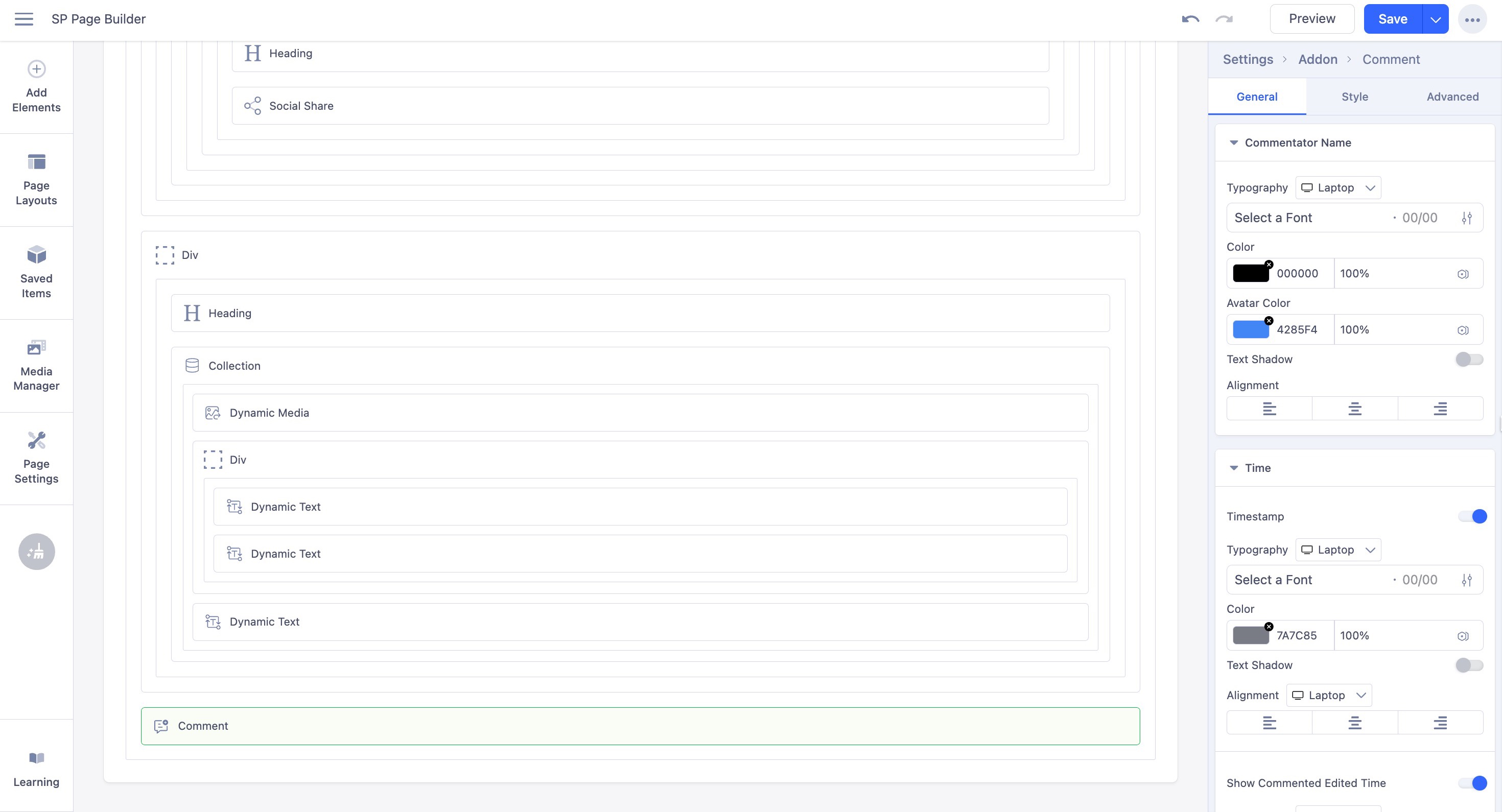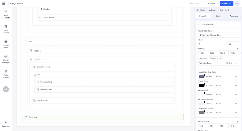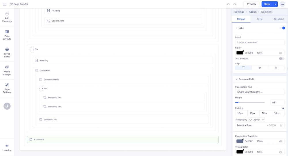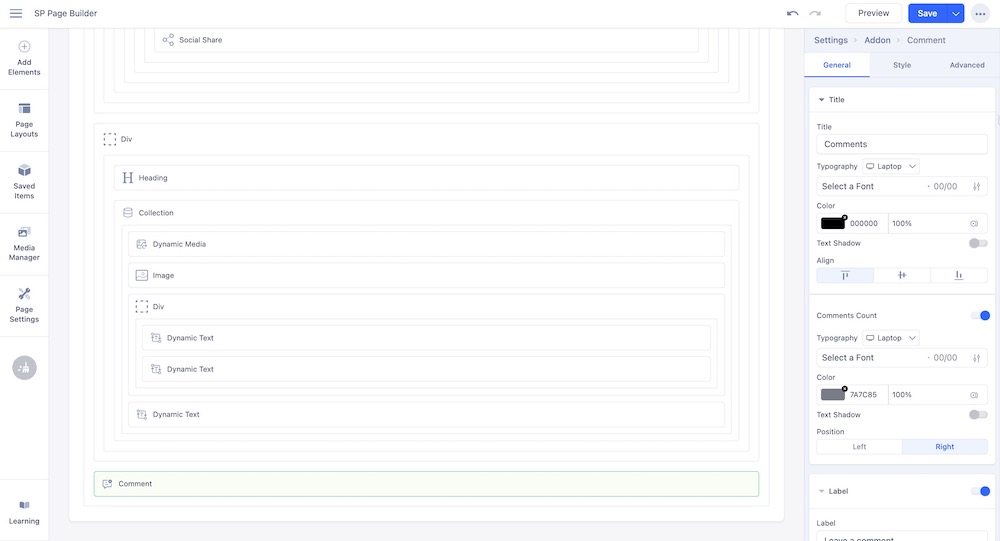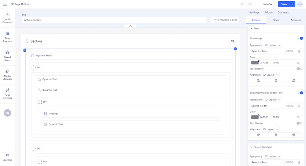 Go to your article details page and drag and drop a Comment addon where you wish to add the comment section. Upon clicking on it, you can customize the comments section, just like any other SP Page Builder addon.