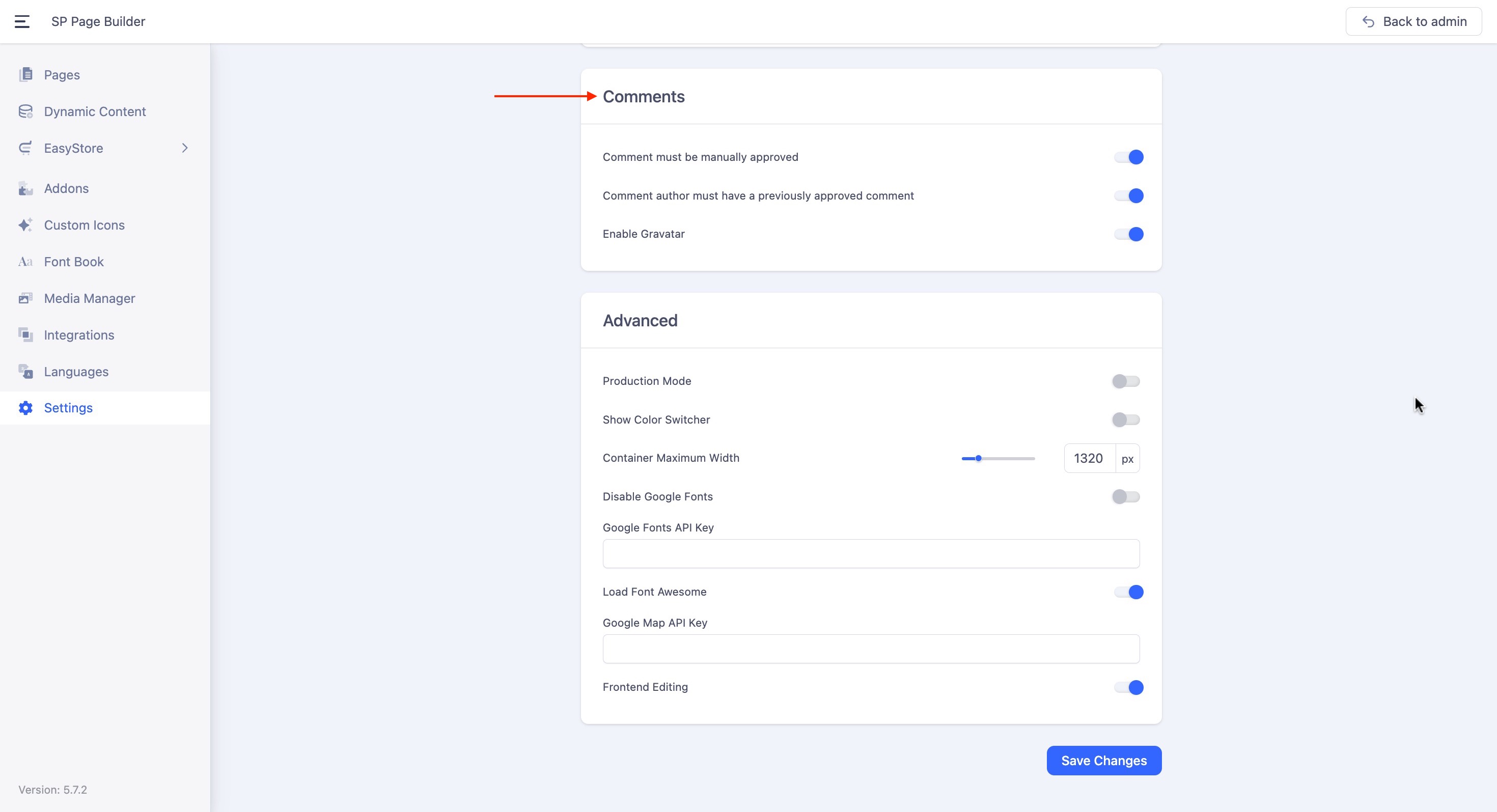 From your SP Page Builder dashboard, scroll down to the Comments section to access settings that control comment behavior: