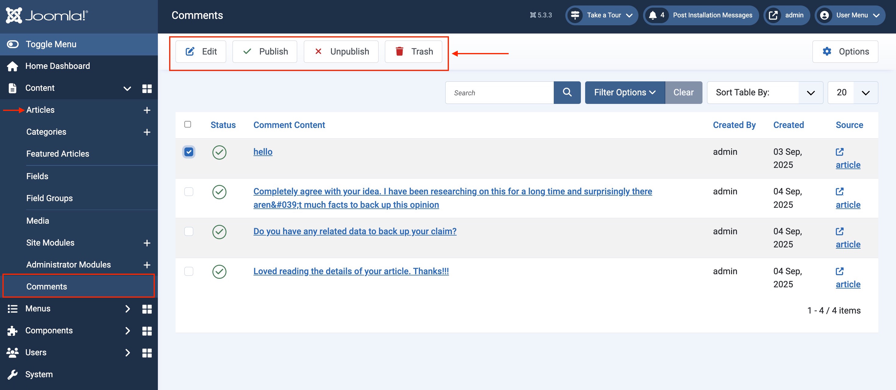 Navigate to Articles > Comments.