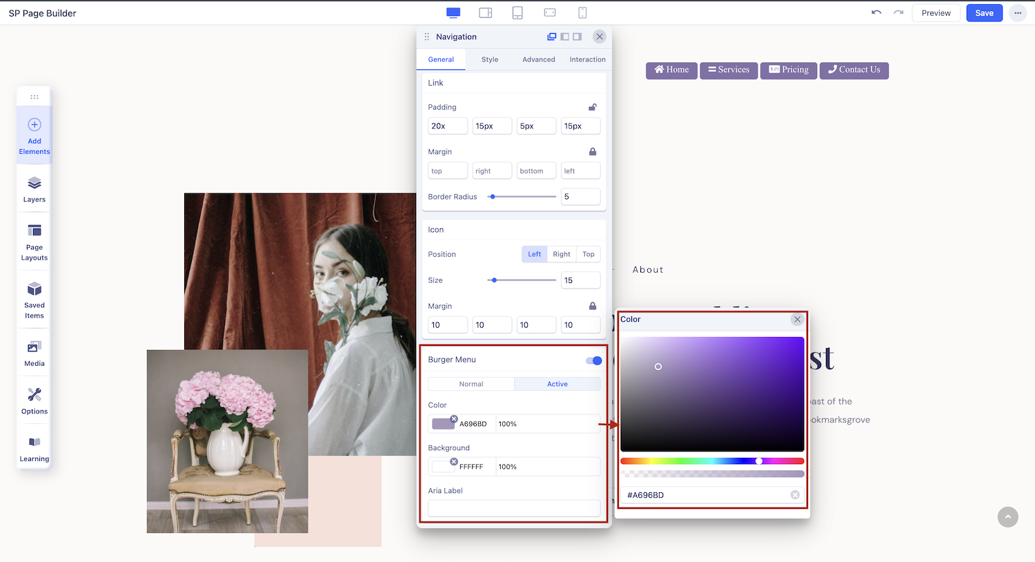 Set the color settings for your Burger menu item texts and background and choose to change the color preferences in the case of Normal and Active.