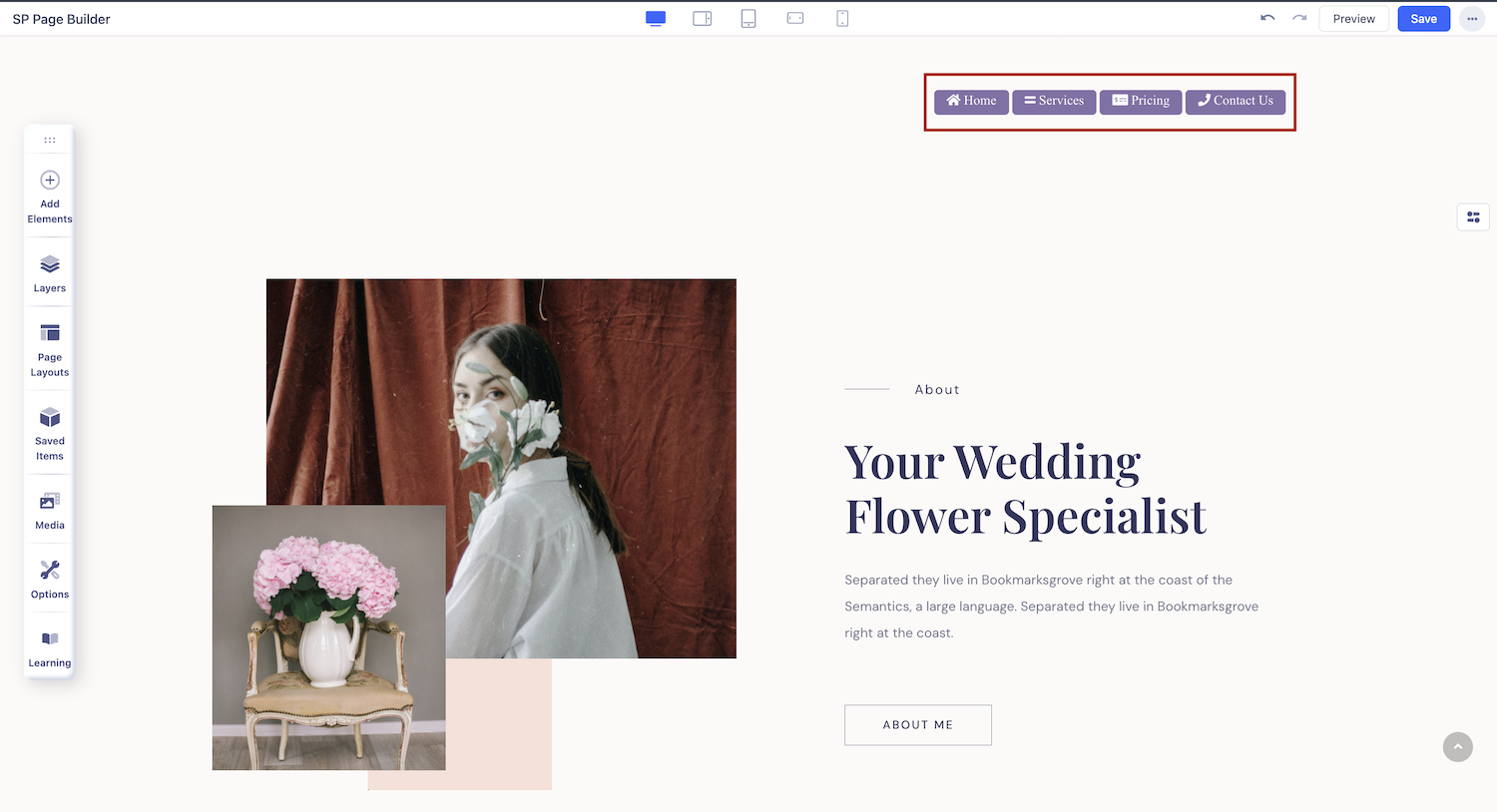 You can add the Navigation addon to your page from the SP Page Builder sidebar. Simply drag the addon from the Addons panel and drop it on the section of the page where you want to add a Navigation addon.