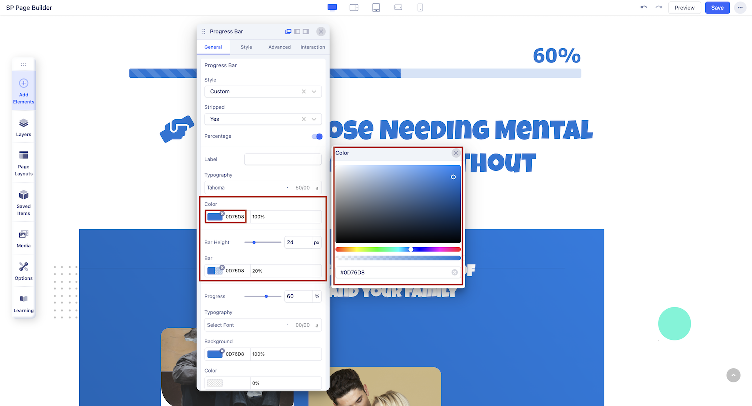 Change your Progress Bar’s color scheme using the Color Settings. From the Color section of the settings panel, you can customize the colors for the Bar, Progress, Label, and Percentage. Clicking on the color box will open the Color Picker window, allowing you to select your desired color easily.