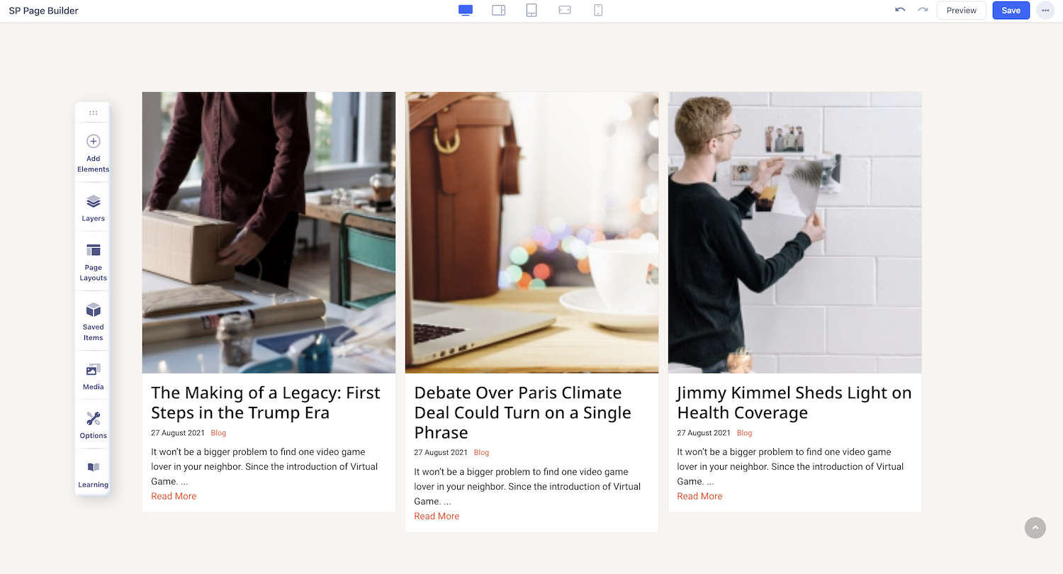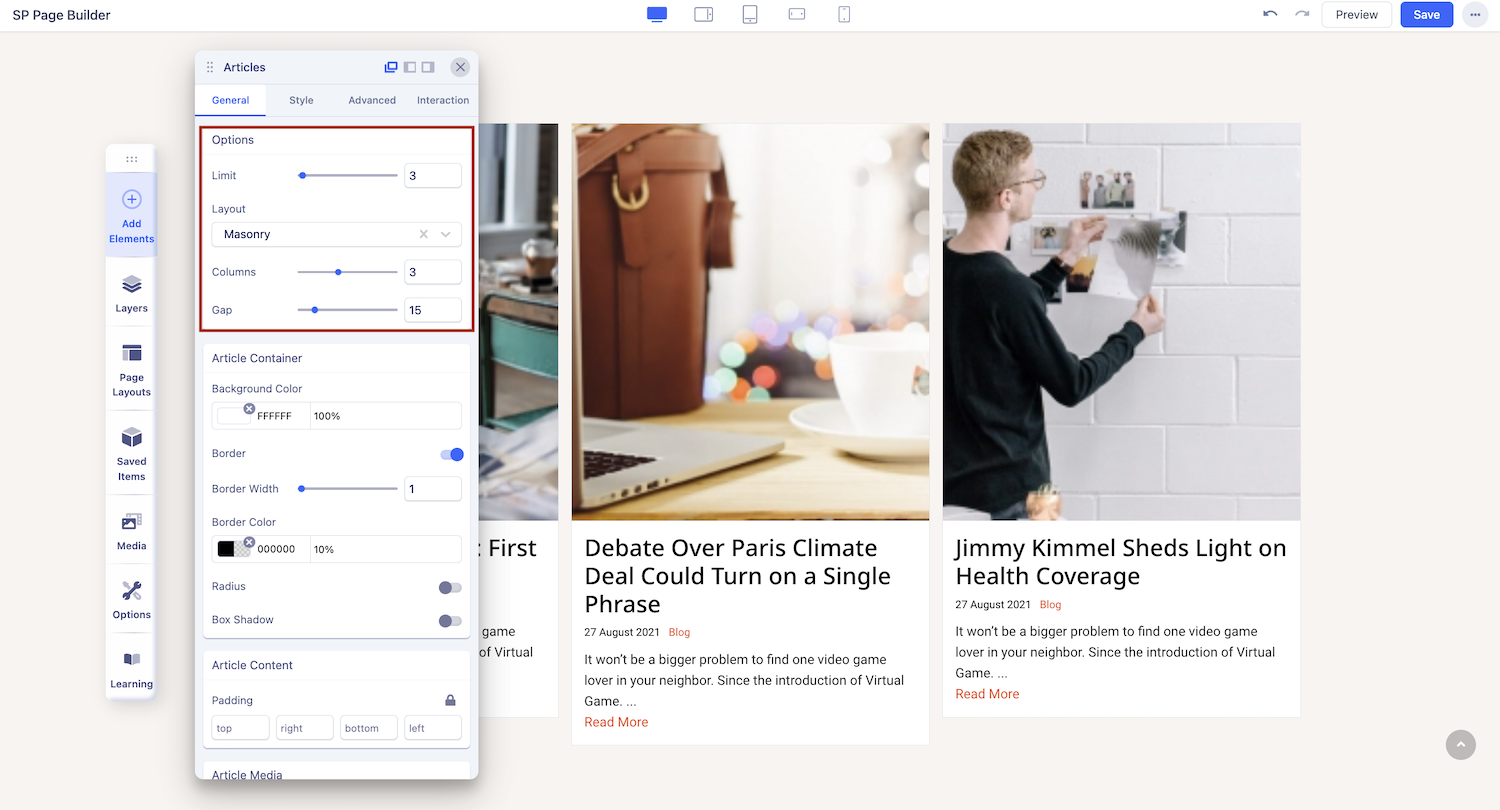 Layouts: The layouts option lets you choose the layout of your Article addon’s article list. You can choose from a range of options like Default, Editorial, Side by Side, Masonry, and Magazine.
