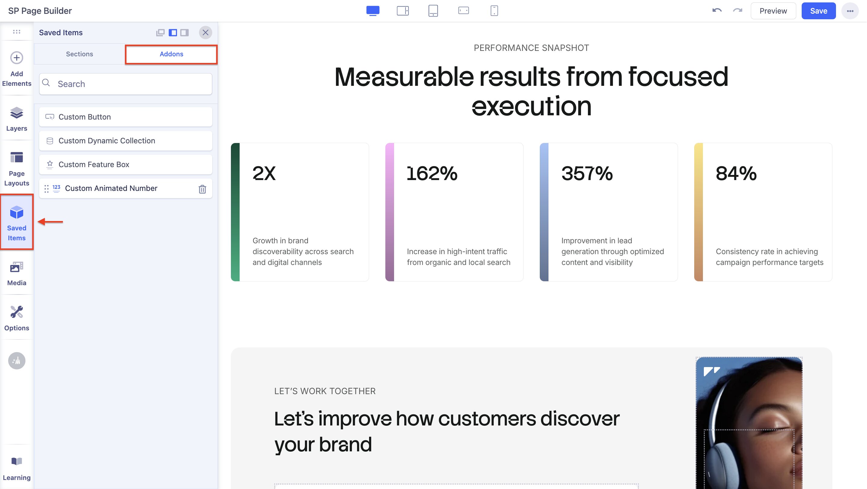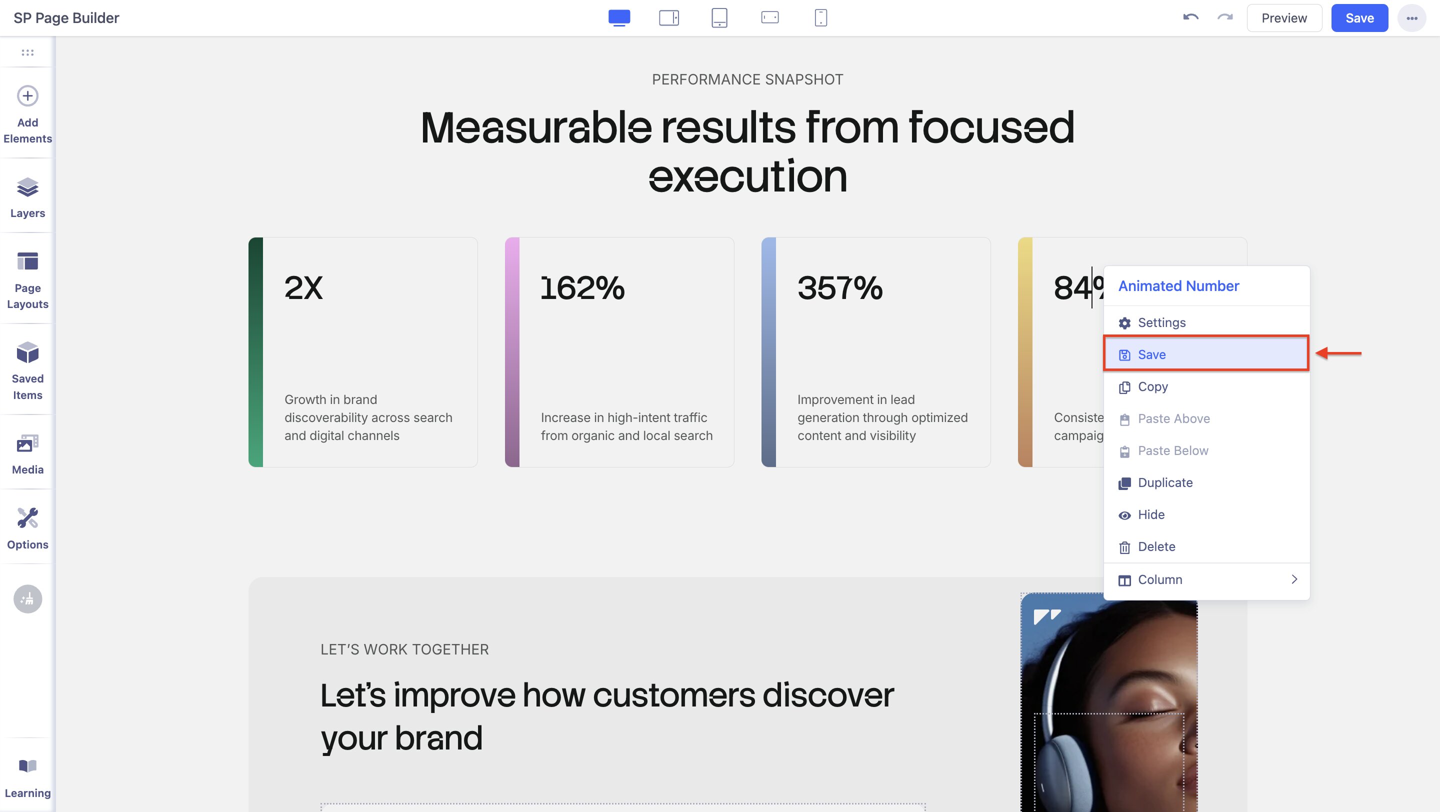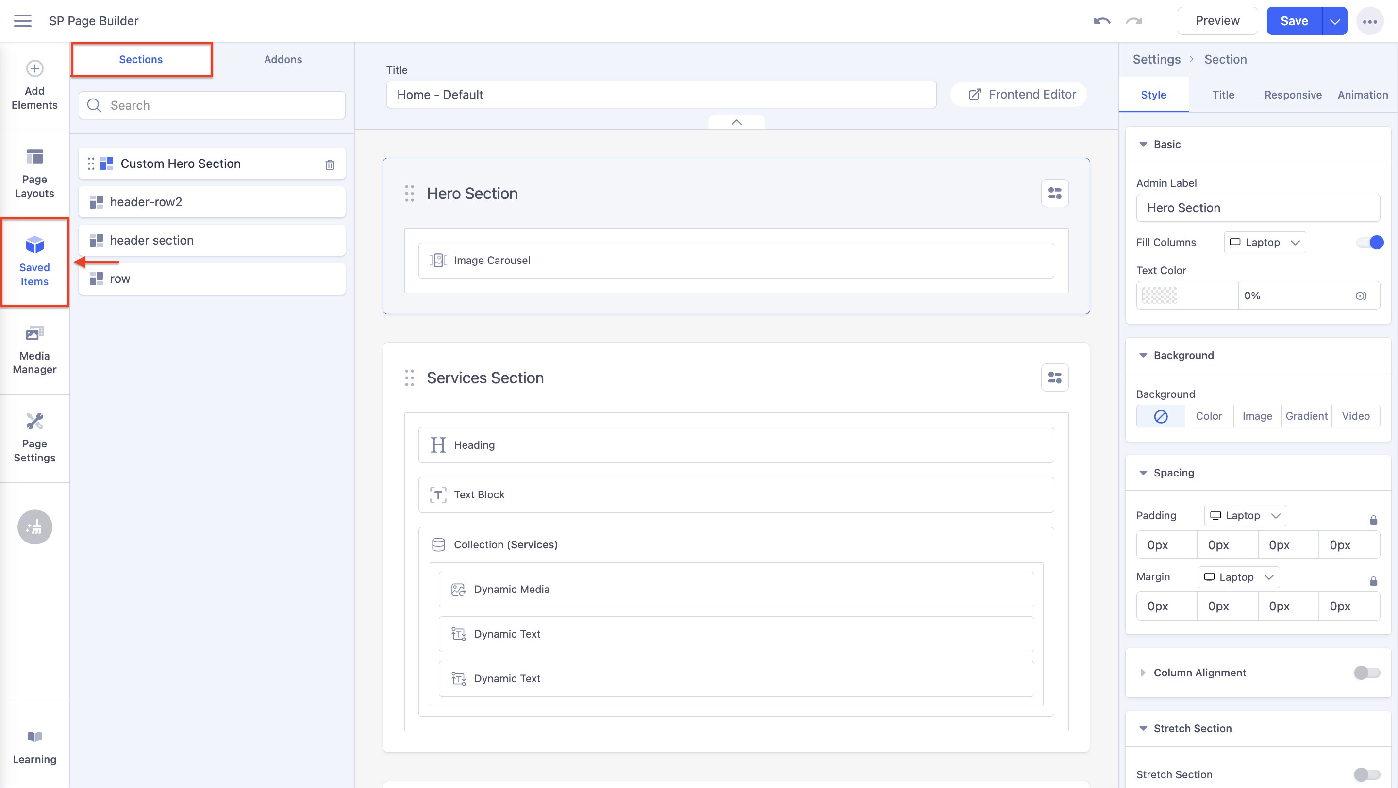 Later, you can reuse it any time from either the frontend or backend editor by going to Saved Items > Sections.