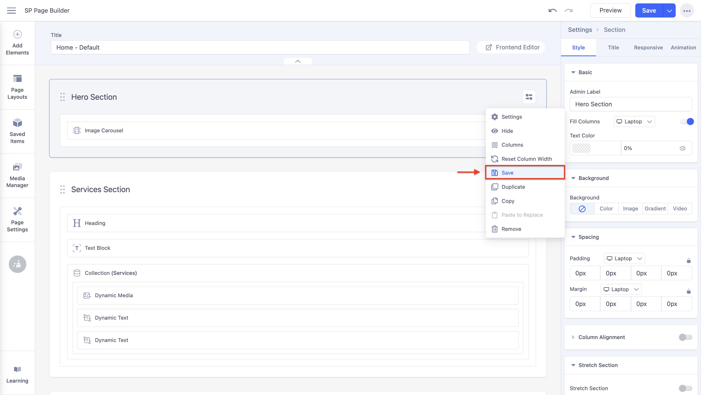 After you’ve created a section and put everything you need inside, you can then save the entire section and save it for later use. To do so, click on the Settings icon in the top-right corner of that section, then click on the Save button. See the screenshot below.