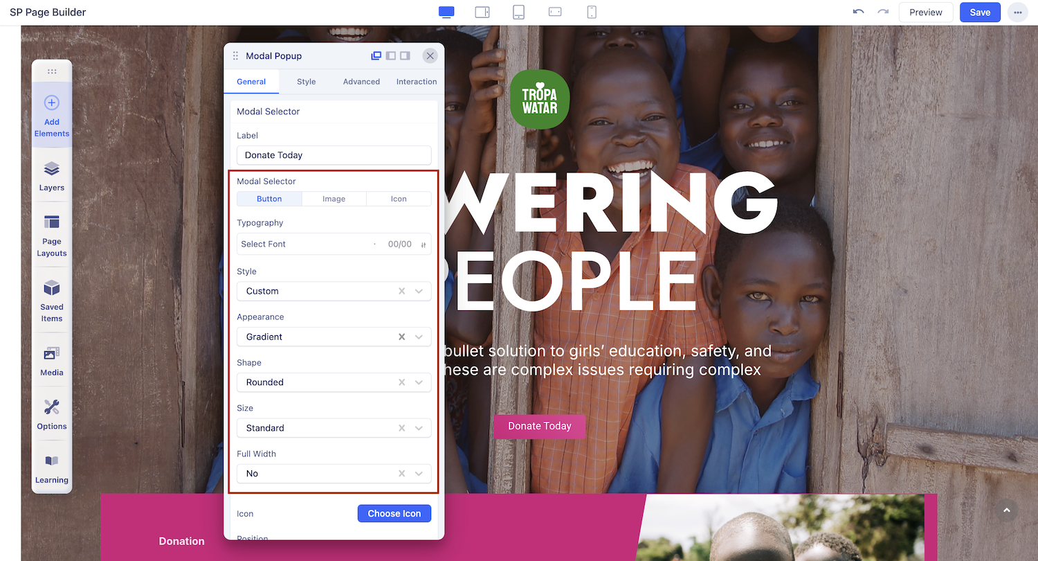 Typography: Set the font type, font size, and style of the font text from this tab.