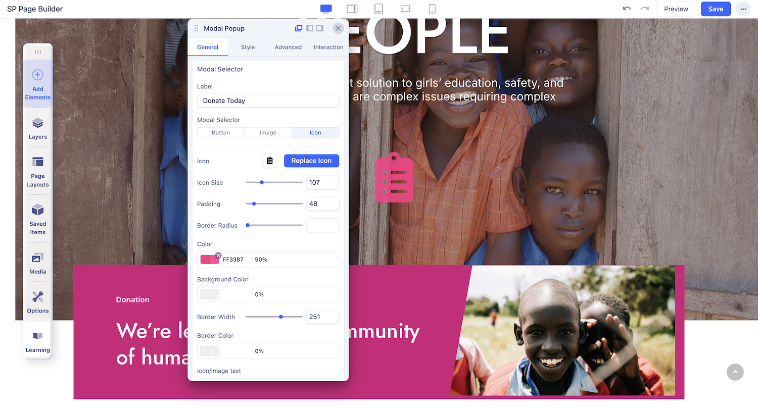 When you click on the Modal Popup addon, the addon settings panel will open up. You can access the addon settings from here and customize the addon to fit your needs.