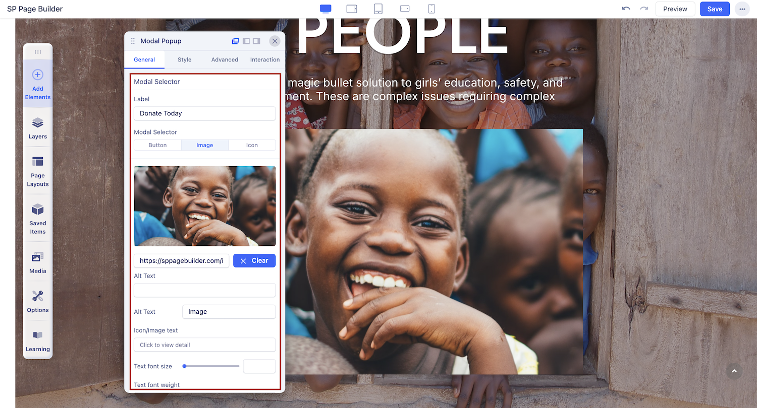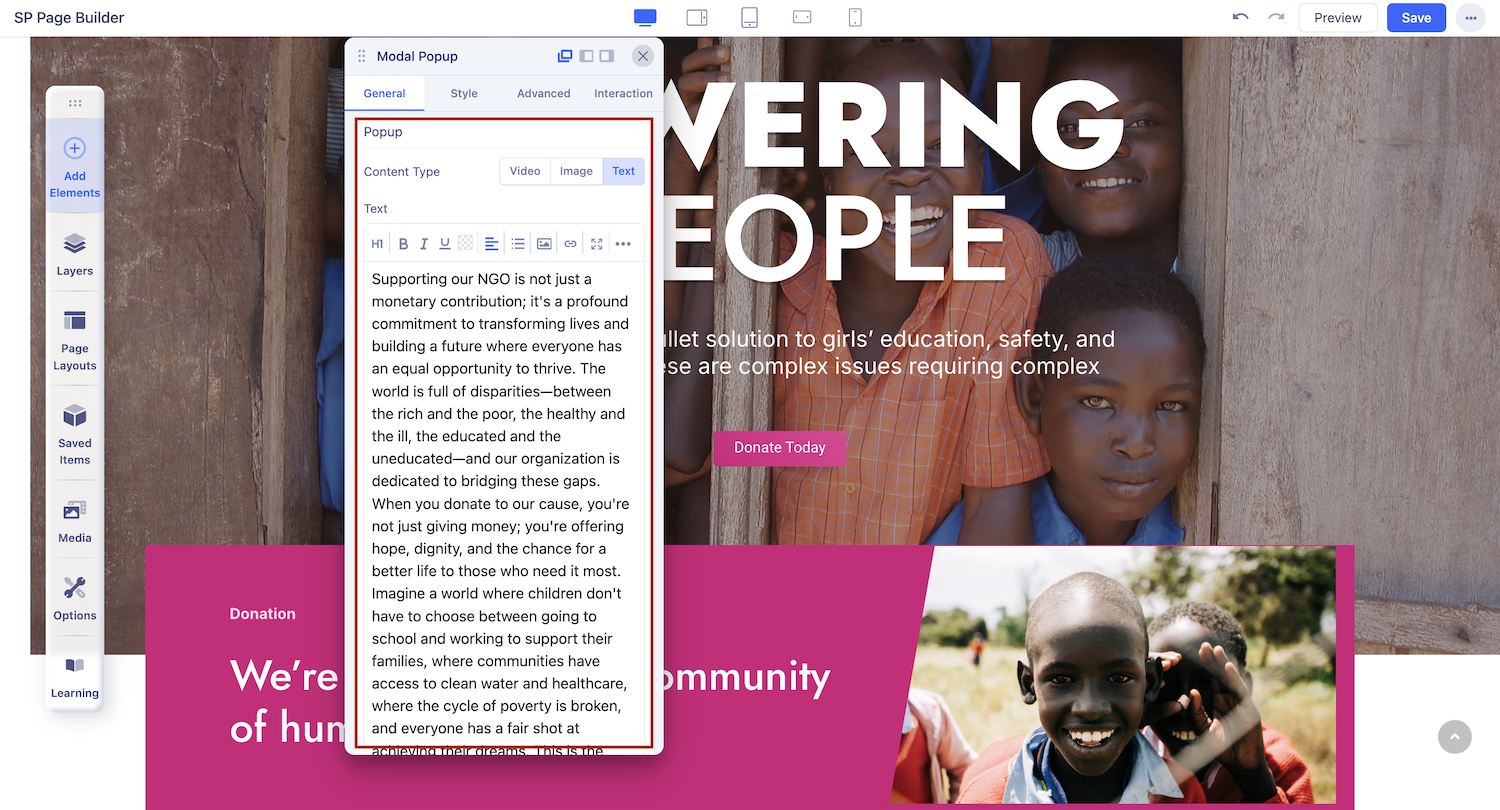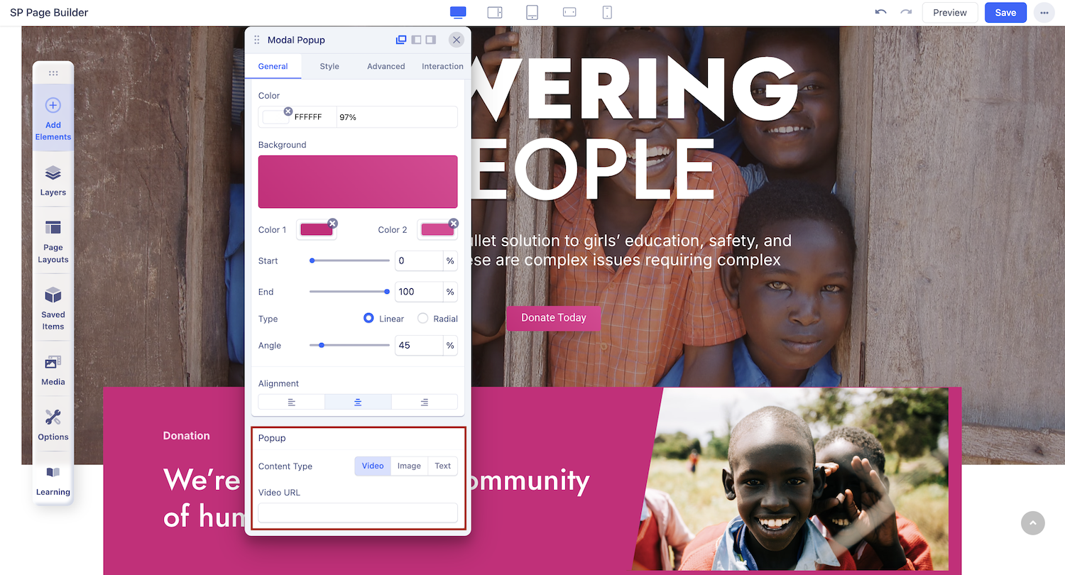 There are three types of popup available in SP Page Builder—Video, Image, and Text.
